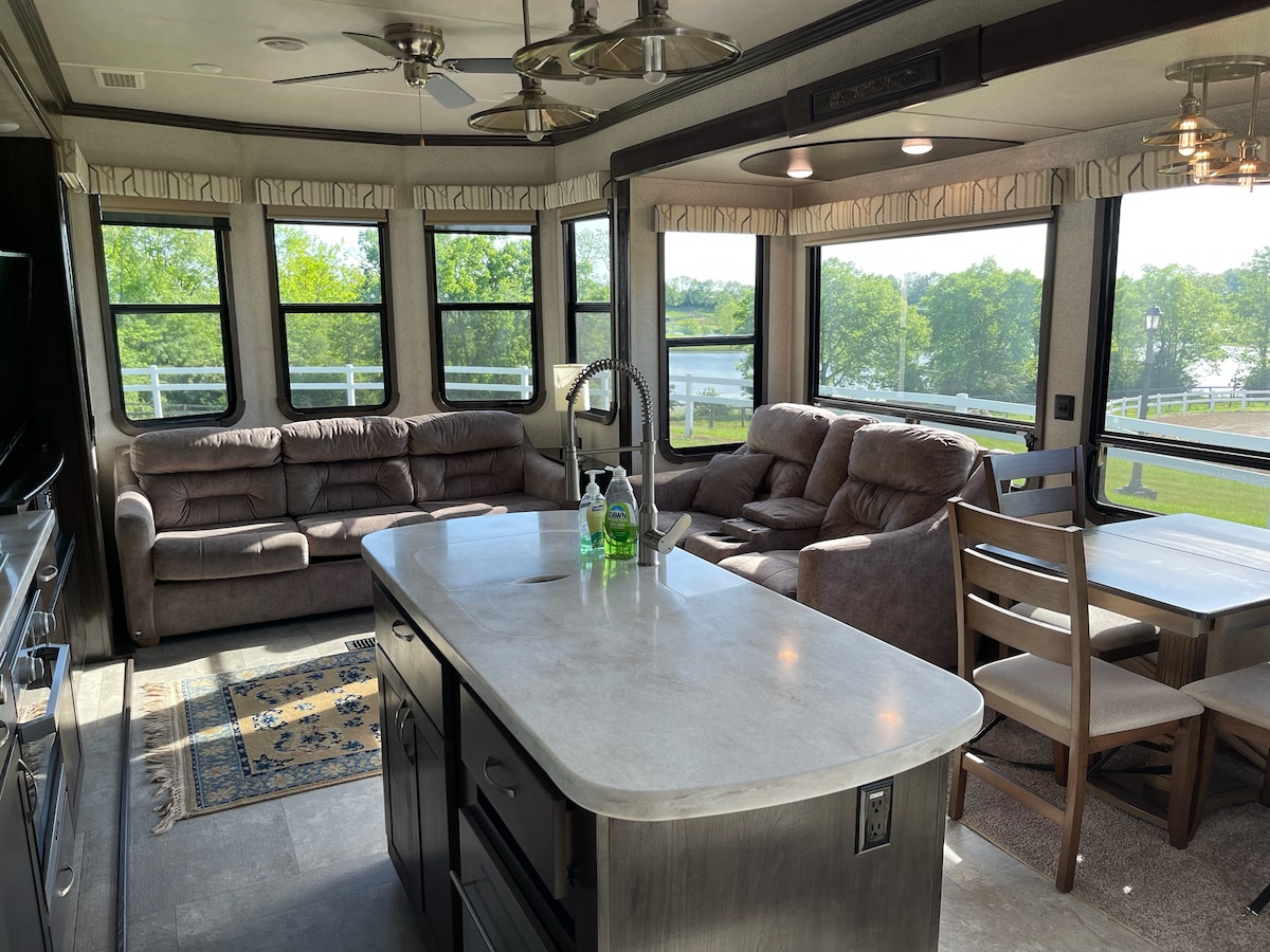 You won’t forget your time in this memorable place. Glamping in style in a nice Motorcoach! Enjoy numerous amenities on site. Enjoy our pool with dual tube water slides, relax outside on your picnic table or around the fire ring, take your dog to the dog park, show the kids the playground and bounce house area, fish in the lake, and much more! Placed in a gorgeous RV Park located in Northern Georgetown, KY. Plenty to do and much to enjoy!