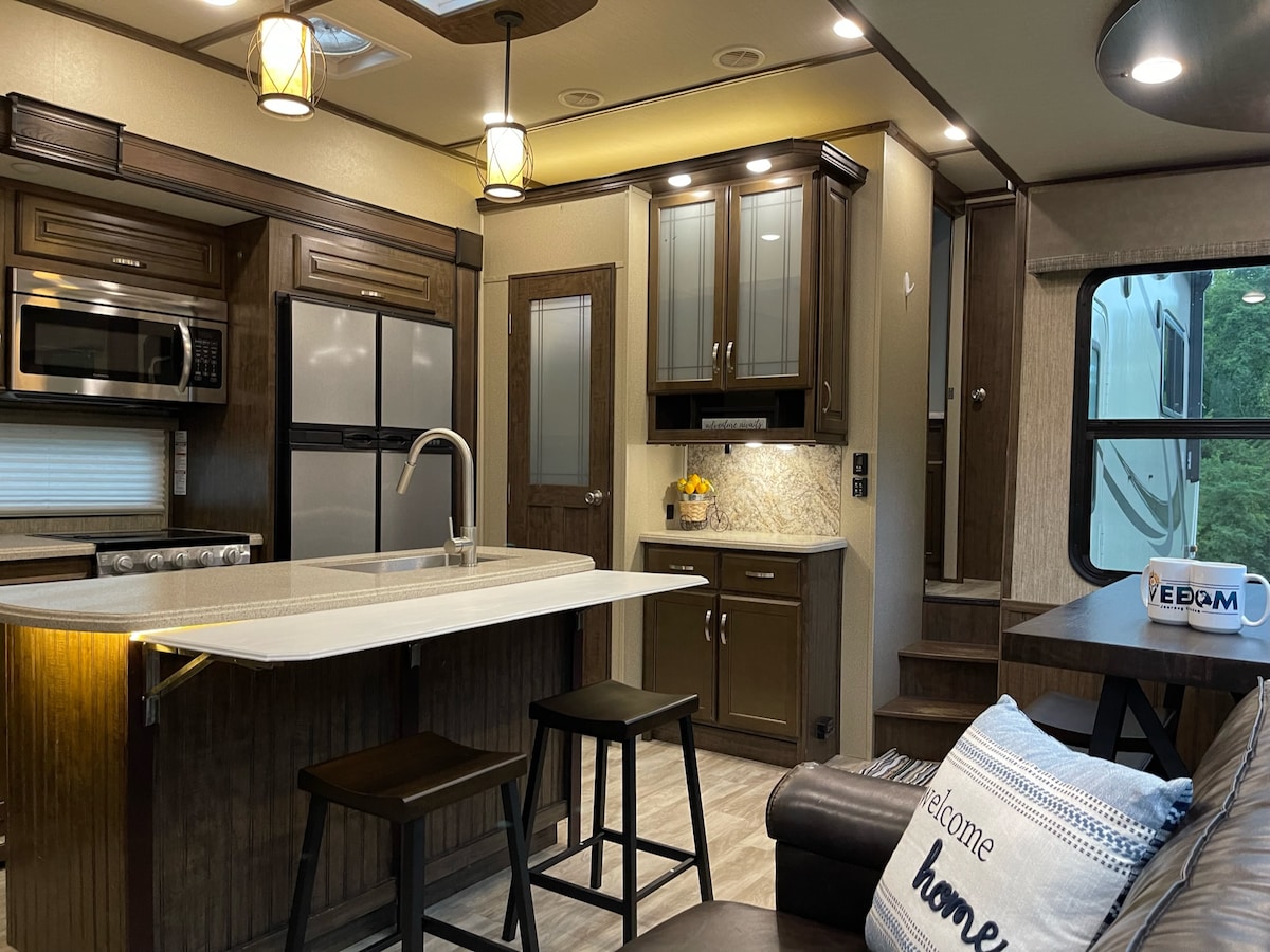 Our 2018 Keystone Montana High Country offers true luxury on wheels! Featuring a king-size master suite, spacious bathroom with double sinks and walk-in shower, cozy fireplace, and multiple TVs, it has all the comforts of home. With premium finishes and the whole nine yards of amenities, this fifth wheel is the perfect choice for couples or families seeking comfort and style on their RV getaway.