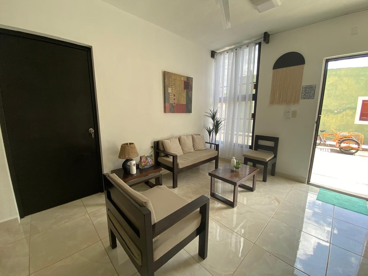 Este bonito departamento cuenta con 1 cuarto con cama matrimonial y juego de sábanas y almohadas, closet, cortinas, burós y aire acondicionado, ventiladores de techo, sala para 4 personas, comedor para 4 personas y cocina con refrigerador y estufa, baño completo, y área de lavado, contamos con agua caliente y fría, así como también utensilios para cocinar.
