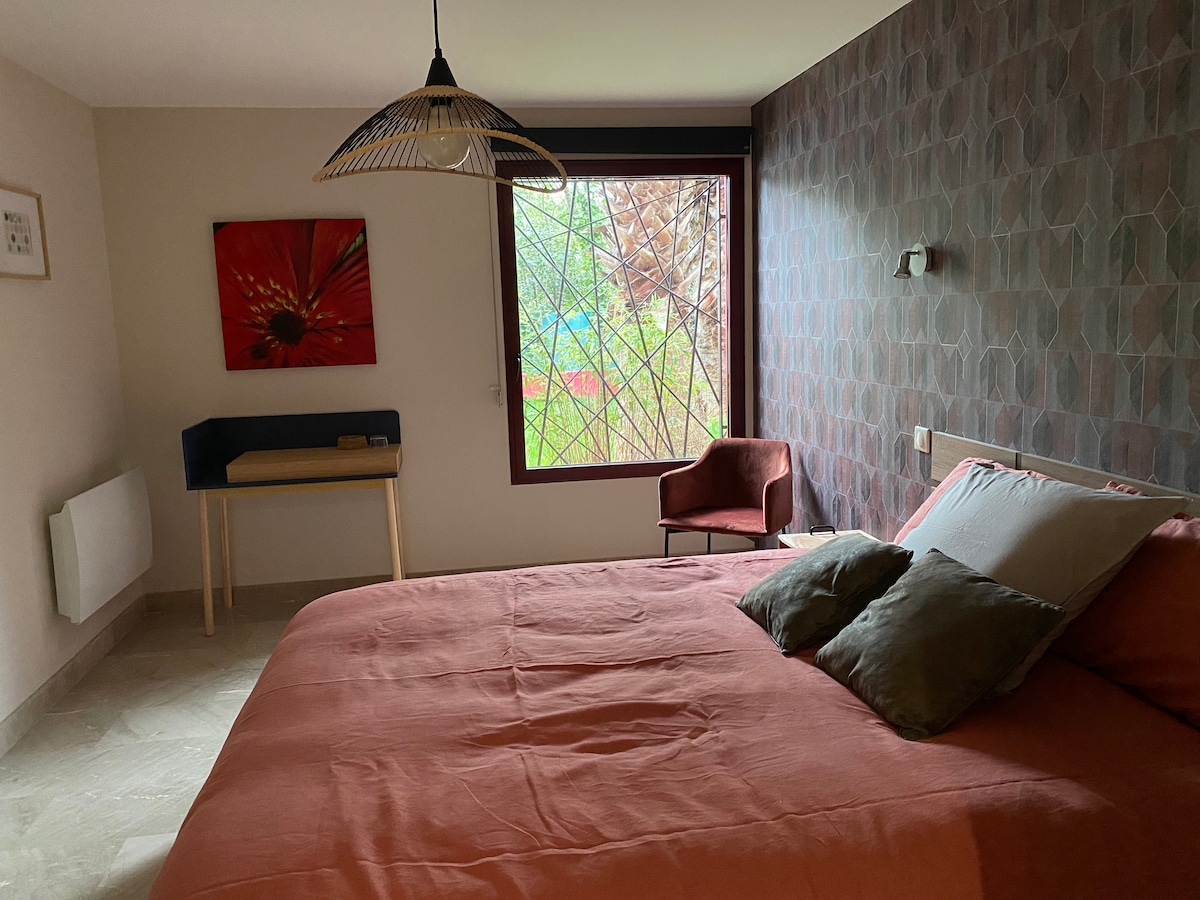 Chambre privée dans notre villa familiale à proximité de Montpellier. La chambre est bien équipée et spacieuse, possédant une porte fenêtre donnant sur le jardin, une vue paisible sur la piscine et les arbres. Petit déjeuner gracieusement offert (thé, café, pain, confiture....). Une salle d'eau privée vous sera réservée, directement accessible depuis la chambre (un couloir à traverser). L'environnement est remarquablement calme, parking gratuit dans la rue, accès tramway à pied (25 min environ).