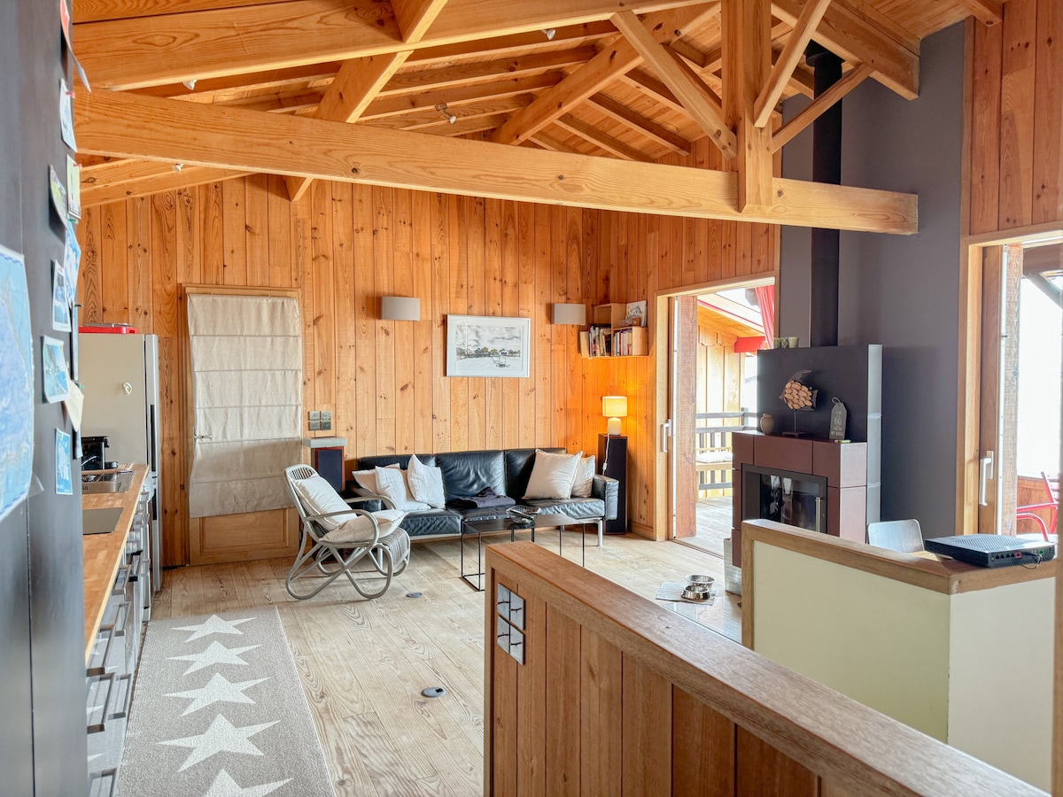 Nichée dans l'authentique village du Four, première ligne les pieds dans l'eau avec son accès direct à la plage par son escalier privatif, maison esprit cabane toute équipée offrant un confort en toutes saisons Séjour cuisine us équipée ouvrant sur une terrasse en surplomb de la mer et de la plage, sdb, wc ind, chambre étage de 22 m² avec balcon "vue mer bassin d’Arcachon et dune du pyla" lit 160, chambre en rdc avec un lit double et un simple baignade au pied de l'escalier, détente assurée