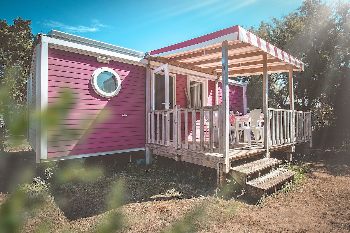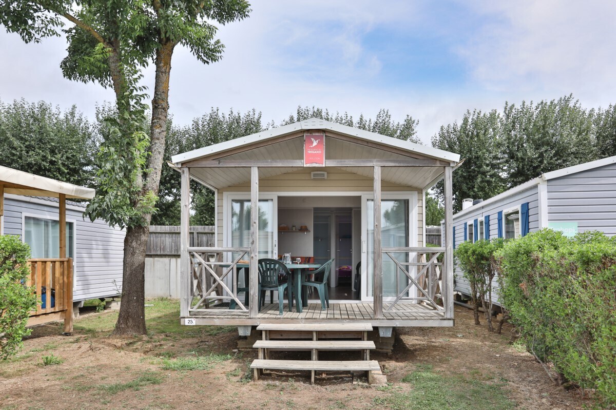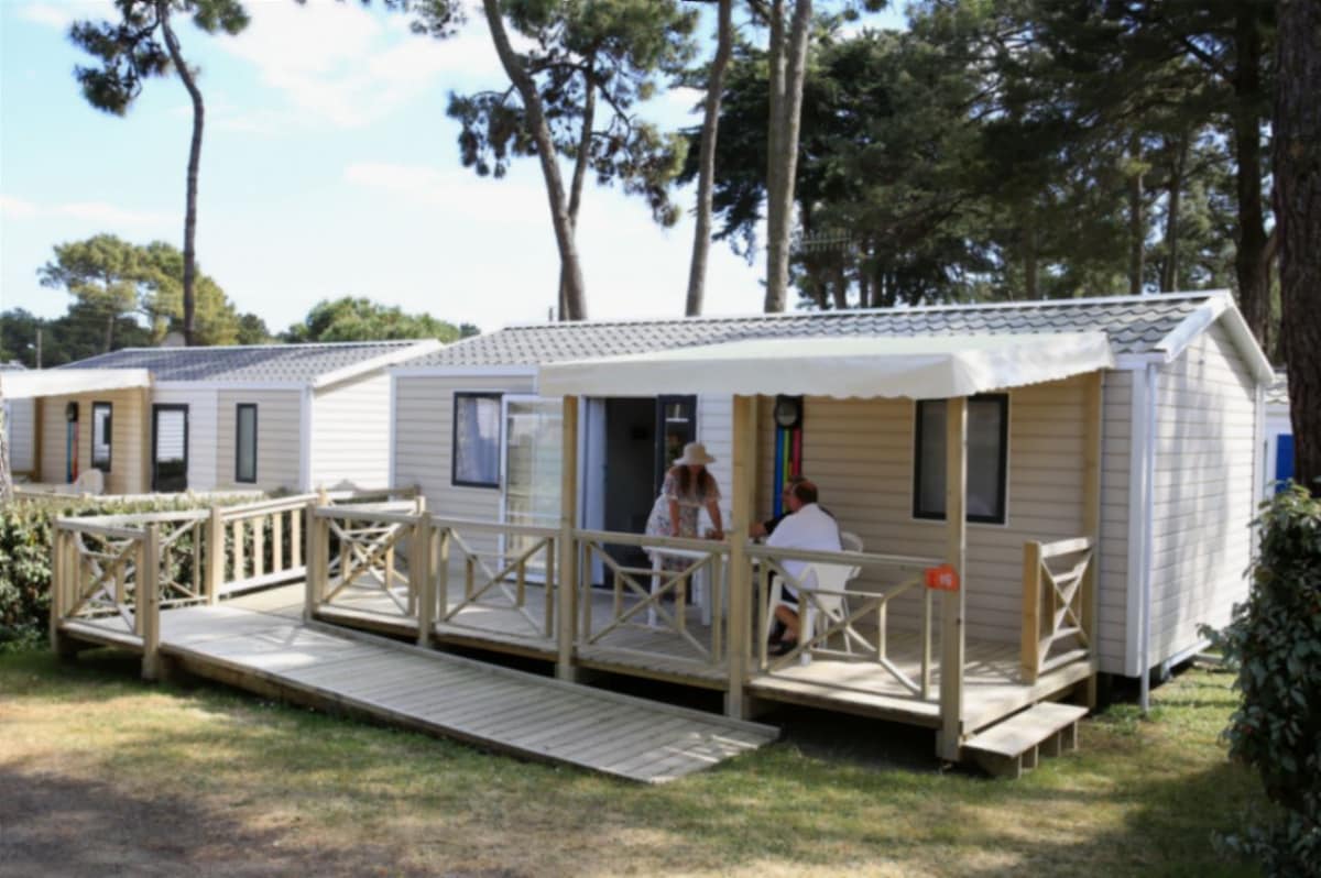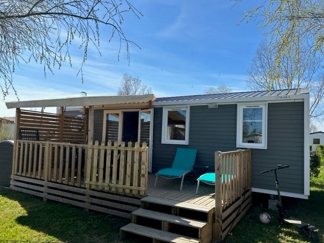 Mobile home comprising a large living room, fitted kitchen, 2 bedrooms: 1 with a double bed (140 x 190) and 1 bedroom with 2 single beds (80 x 190). 1 bathroom with shower, washbasin and WC. A fully covered terrace with dining table and plancha. A terrace on the ground floor with furniture, an outside bathroom with shower and washbasin. July - August - September: weekly rentals only.