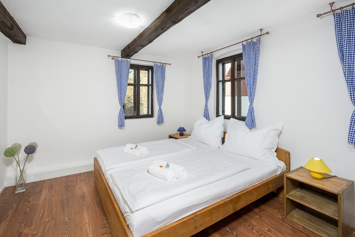 Nestled in the heart of Liberec Old Town, you'll be steps away from local attractions, cafes, and shops. This two-story apartment features a cozy bedroom upstairs, providing privacy and a unique living experience. An extra bed is available to comfortably accommodate larger families or groups of friends. While our apartment has an old-world charm, it is meticulously clean and well-maintained to ensure a comfortable stay.