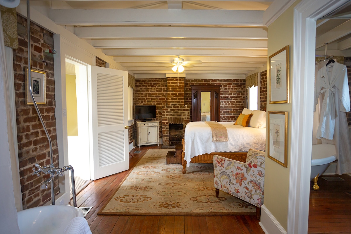 6 years as AirBnB SuperHosts! Bring Romance or work.. escape to Savannah at your doorstep, with a gorgeous beach 25 minutes away. Private bathroom, fridge, coffeemaker and large Smart TV. We're close to some of Savannah's finest restaurants and bars. 4 minute walk to Foxy Loxy cafe (amazing place) and 12 minute walk to Forsyth Park. One note: the suite is on the second floor with a staircase. Central filtered Air and Heating. Not suitable for pets or young children. Private, with key.
