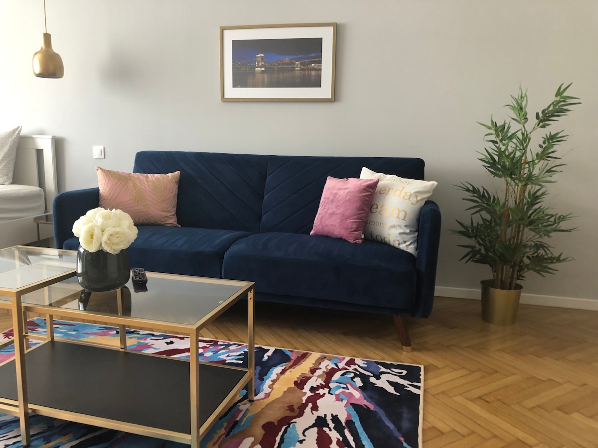 Have your dream Budapest stay in this beautifully designed, luxurious apartment in the absolute center of Budapest, in its best neighborhood. It's a minute from the Parliament and the Danube, within a short distance of most tourist attractions and the best dining and entertainment Budapest offers. The apartment has a separate bedroom and living room set up, and it's nestled away on the top floor (there is an elevator), giving extra privacy and tranquility.