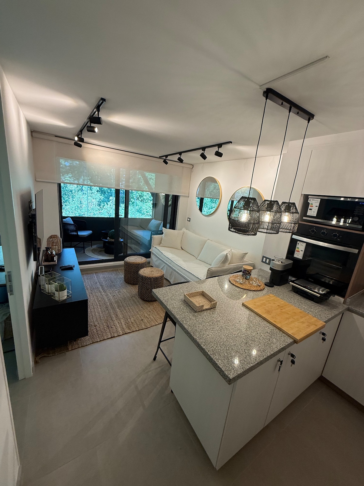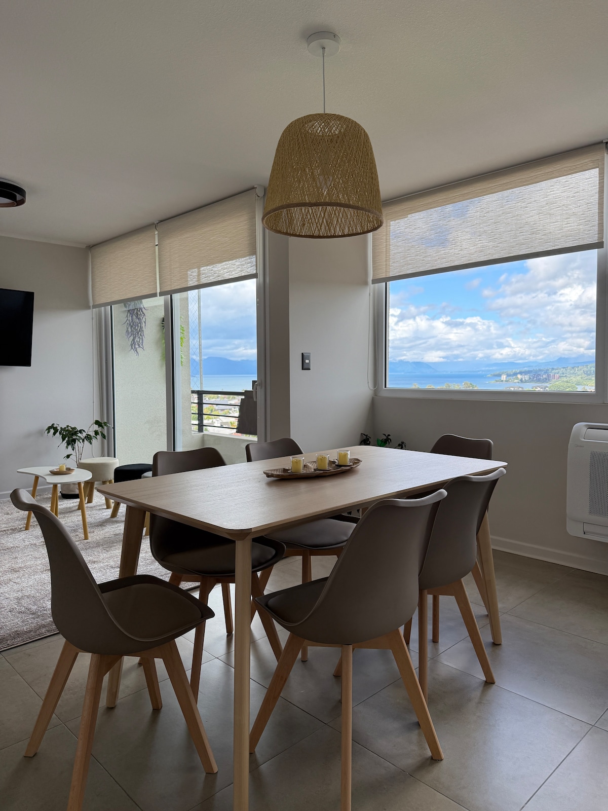 Nuevo y acogedor estudio en la mejor ubicación de Pucón, a pasos de playa grande, centro, y aislado del ruido de la calle principal. Cuenta con cama de 2 plazas, un futón de 2 plazas, cocina full equipada, baño completo, WiFi, TV 49" con Netflix, Disney+ y más, terraza, calefacción, parrilla, cafeteras, 2 bicicletas de uso ilimitado, entre otros. Estacionamiento público frente al acceso al edificio disponible. Incluye ropa de cama, toallas, e insumos básicos de baño y cocina para cada estadía.