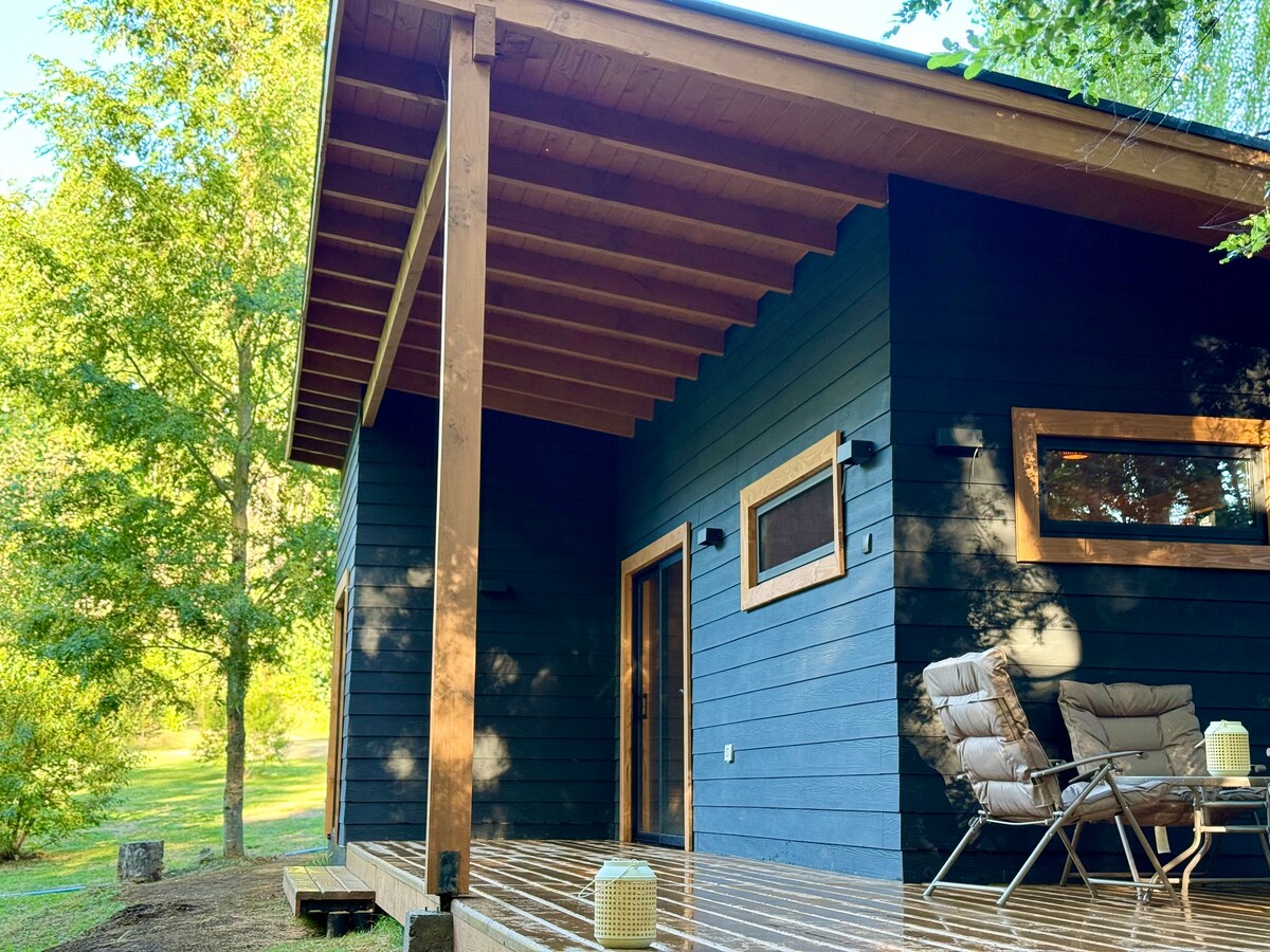 The cabin has a natural feel and rustic touch within amazing surroundings of the native forest and trees all around you. The cabin has been built with native and sustainable wood. it is well equipped. Is very cute and cozy space with a large veranda with an outdoor seating. There is a nice river with access within the property with a picnic table next to it to enjoy listening the river. Big sunny green garden, picnic table to enjoy the view of the mountains, a fire-pit and couple of hammocks.