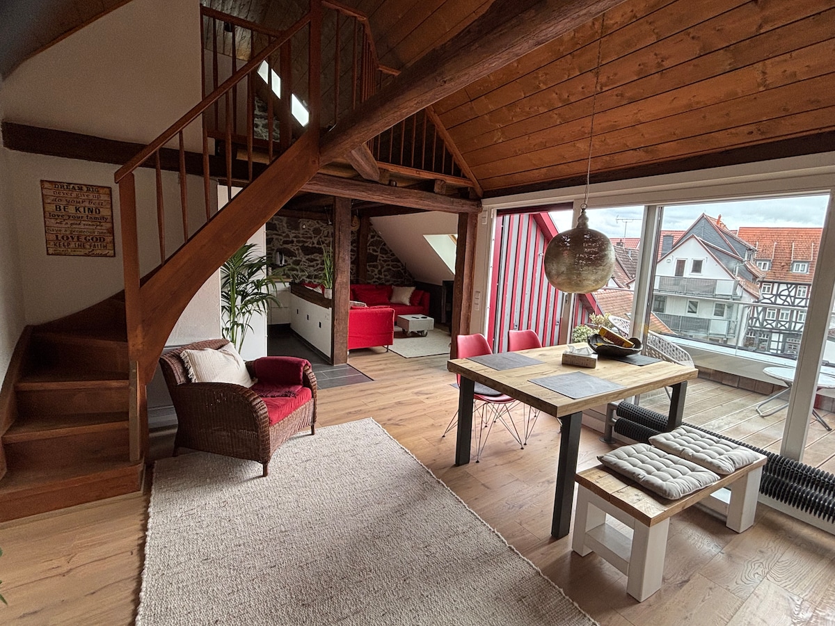 Unsere Ferienwohnung (ca. 35 qm) liegt zentral im Ortskern der historischen Altstadt von Butzbach, der Perle der Wetterau. Der mittelalterliche Markplatz mit seinen historischen Fachwerkhäusern gehört zu den schönsten in Deutschland. Die Wohnung hat einen separaten Eingang mit Videotürsprechanlage. Durch die zentrale Lage sind alle Einkaufsmöglichkeiten, Cafés und Restaurants unmittelbar fußläufig zu erreichen. Der Bahnhof befindet sich 3 Fussgängerminuten entfernt.