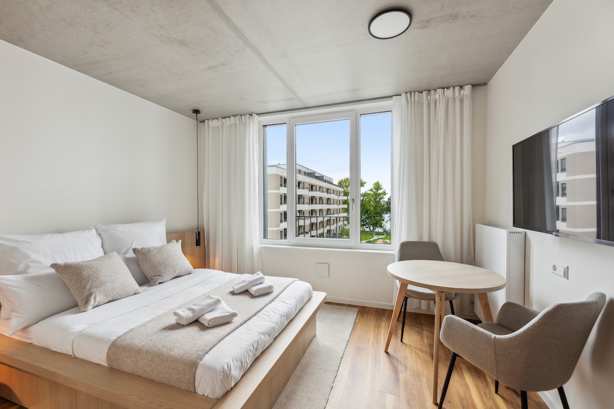 Enjoy the perfect blend of comfort and functionality in our thoughtfully appointed room, ideal for both short visits and extended stays. With 22–24 m² of living space, this room features a combined living, working, and sleeping area, making it especially well-suited for any traveler. You'll sleep soundly in a comfortable double bed, and the dedicated work area provides the ideal setup for productive days. The room also includes a cozy seating area with an armchair