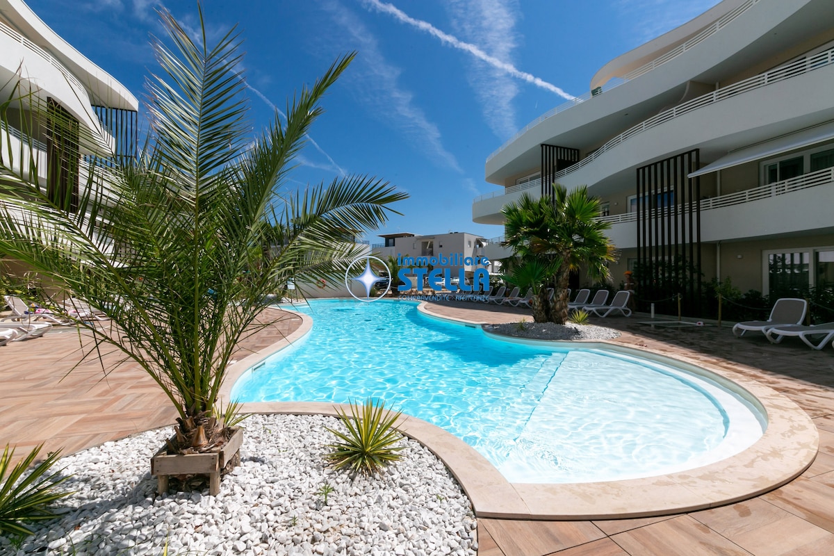 Nuovissimo appartamento con ampia piscina di 50 metri circondata da sabbia bianca con lettini prendisole e palme tropicali. Si trova a soli 400 metri dal mare, in una zona tranquilla a pochi passi da Piazza Nember. Un luogo perfetto per trascorrere una magnifica e rilassante vacanza con la famiglia. Numero di registrazione 027019-LOC-09272 Codice struttura CIR Z10755