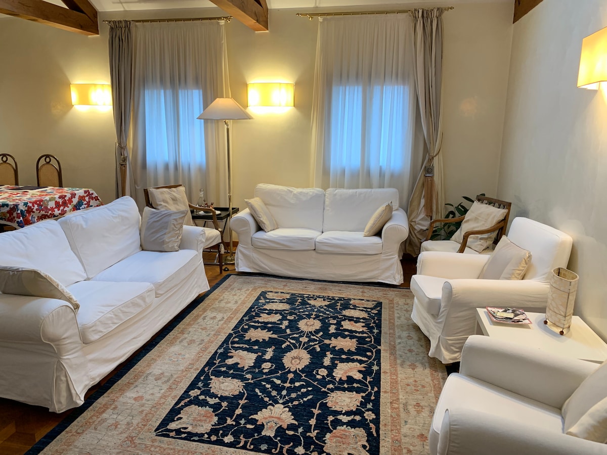 The living room has a remarkable view over the wide campo S. Maurizio where a periodic and characteristic antiques market takes place; from the living room you can admire important gothic buildings and the homonymous neoclassic church built by the Venetian architect Gianantonio Selva with its majestic bell tower.