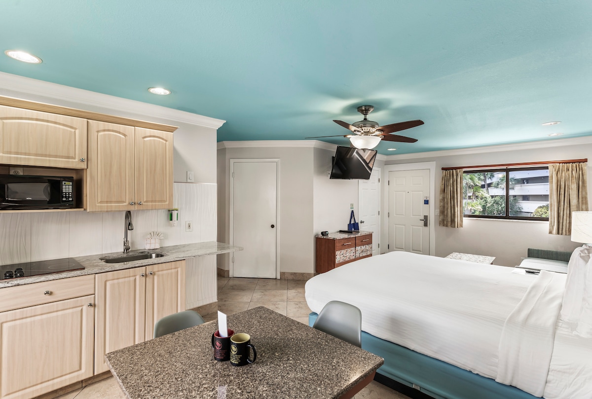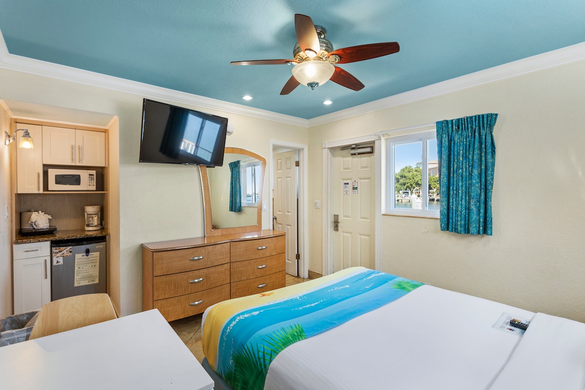 One queen bed. Standard view - no water view. Completely renovated studio offering microwave, mini-fridge, and coffee/tea maker. Individually controlled air conditioning, ceiling fan, non-smoking room, premium Wi-Fi, LED TV, electronic safe, hairdryer, iron and ironing board, direct-dial phones with free local calls. Exterior-corridor with a sitting area outside room.