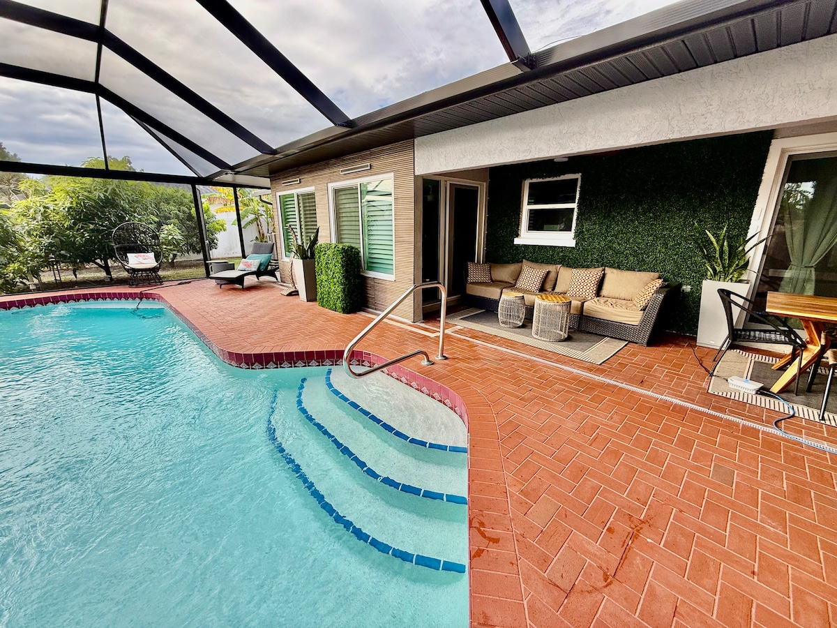 Just outside of Downtown near the Legacy Trail, this home is located in a quiet neighborhood only 15 minutes from the Siesta Key Beach. The home stands out with its bright and airy design, brand new saltwater pool in the private backyard, and its breezy living room. The large master bathroom rain shower is perfect to wash off the leftover sand from the beach. You can also spend your evenings grilling out back or playing corn hole in the patio area.