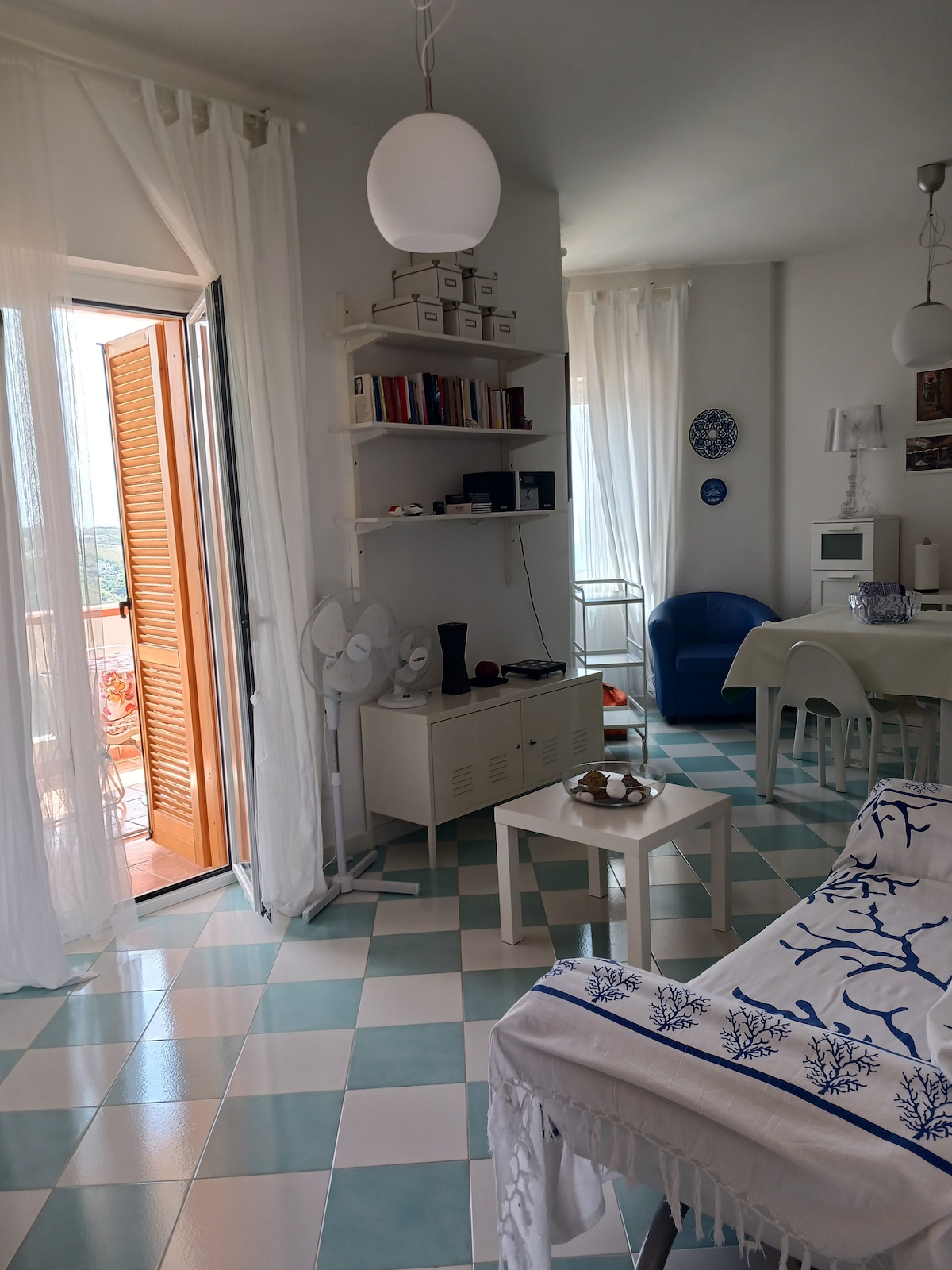 La nostra casa di famiglia di origine. L'appartamento è caratterizzato dalle belle cementine originali: è luminoso, fresco, ventilato, ben arredato e accessoriato. Comodo e tranquillo, con ampio e fruibile balcone a di 5 mq, vista e posizione esclusiva ed incantevole. Pratico parcheggio esterno, non custodito ma sicuro (caserme Loc.Pol/Carab), a 100 mt. Il cuore del paese con negozi, markets, bar e ristoranti è raggiungibile a piedi in meno di 5' e le spiagge, in auto, in 15'.