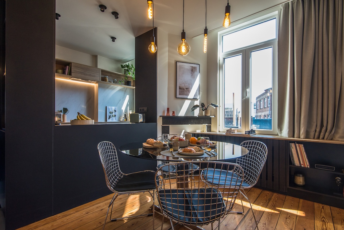 Appartement d’architecte entièrement rénové avec soin, doté de mobilier sur mesure et d’équipements intégrés pour une esthétique sobre et élégante. La salle de bain comprend à la fois une baignoire et une douche. L’espace est modulable selon vos besoins : bureau, télévision ou ambiance épurée — tout peut disparaître pour laisser place à un intérieur parfaitement maîtrisé.