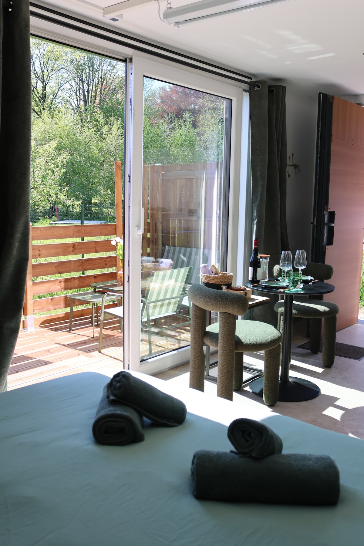 Bienvenue dans cet écrin de bois et de verre où se reflètent les grands arbres. Sur la terrasse, un bain nordique dont vous assurerez vous-même le chauffage au bois, des transats, une table et des chaises sont là pour égayer votre séjour. Derrière le miroir, au-delà de la grande porte coulissante, un délicieux lit double dont il est inutile de décrire les qualités, vous serez seuls juges. Spacieux sauna finlandais, vous profiterez d'une vue reposante sur le magnifique jardin.