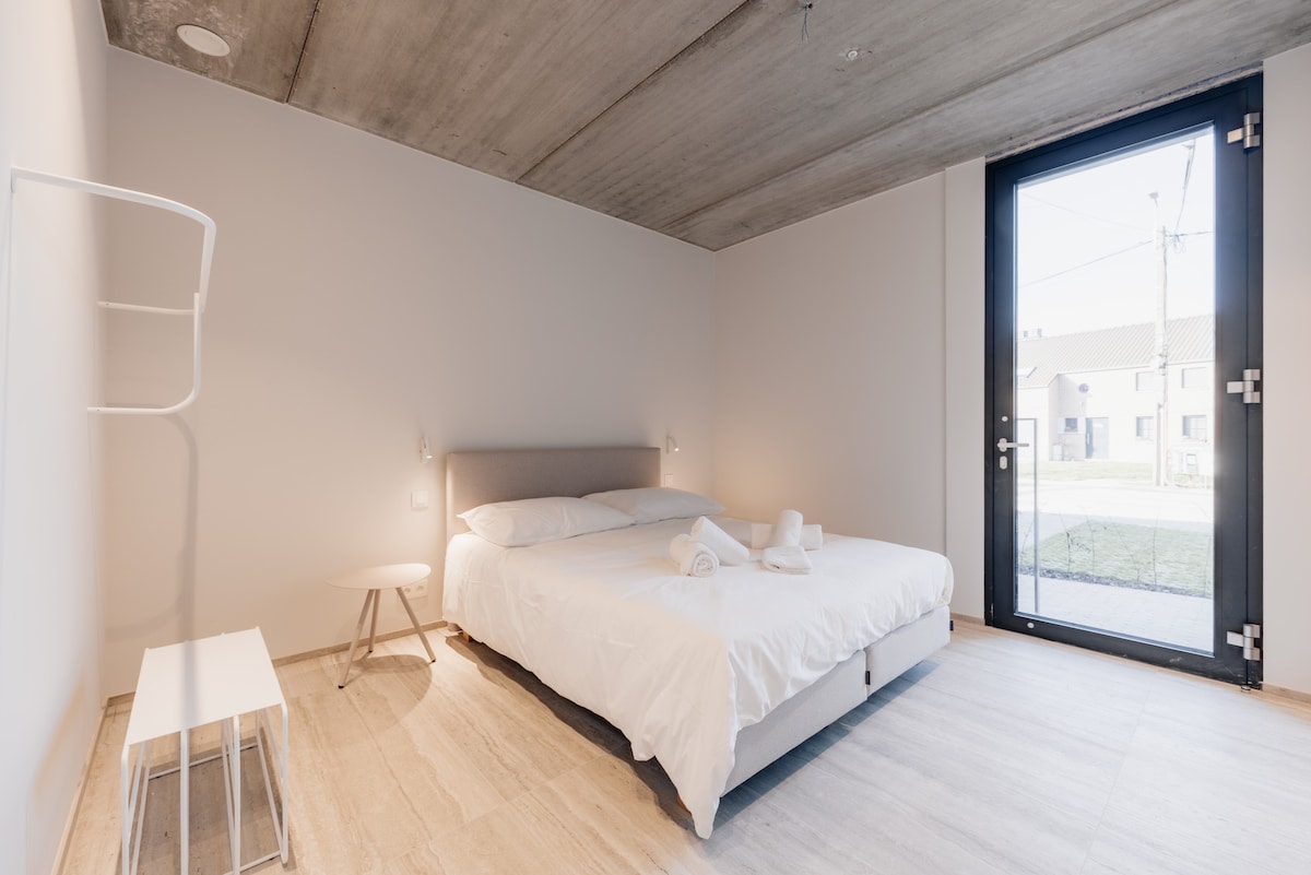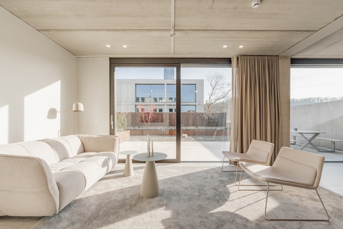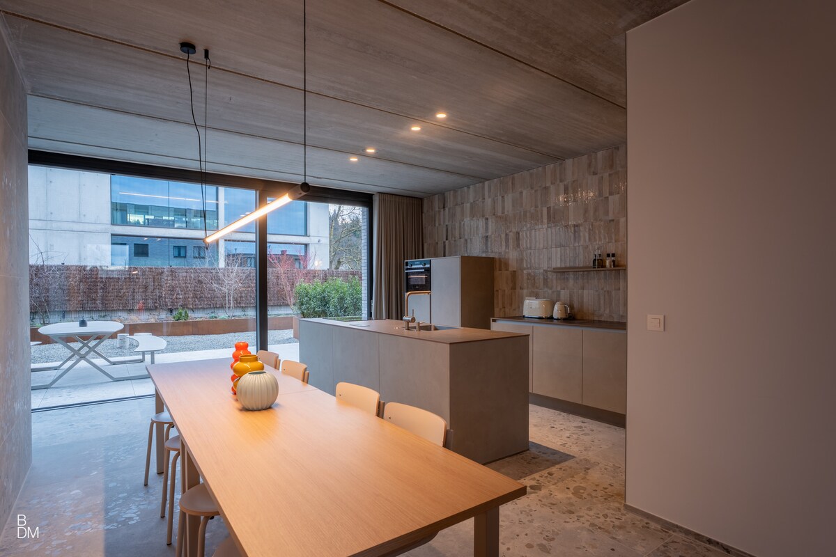Cette maison à Oupeye est un refuge végétal ouvert sur la Meuse. Le bois, la pierre naturelle et les plantes créent une atmosphère apaisante, en lien direct avec la nature. Les larges ouvertures laissent entrer la lumière et le paysage, brouillant la frontière entre intérieur et extérieur. À proximité du centre d’affaires Bord de Meuse (coworking, salles de réunion, salle de sport) et du RAVeL, le lieu est idéal pour travailler au calme et se ressourcer au bord de l’eau.