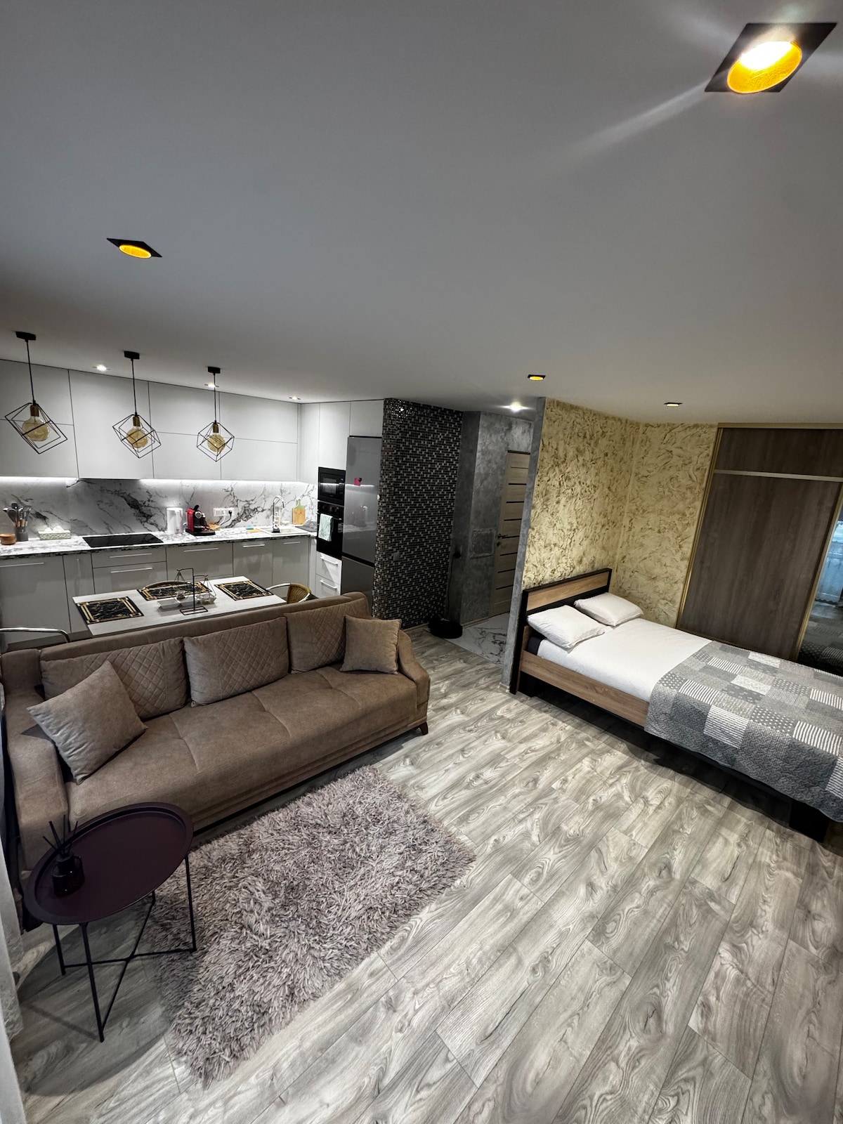 Mājīga un gaiša dizaina studija Liepājas centrā ar king size divguļamo gultu, ēdamzonu, pilnībā aprīkotu virtuvi. Vislielāko uzmanību pievēršu tīrībai – vairums viesu studiju vērtē kā mirdzošu tīru. Studija izskatās precīzi kā bildēs. Plaša, moderna kāpņu telpa. Visa ēka pilnībā rekonstruēta 2020.gadā.