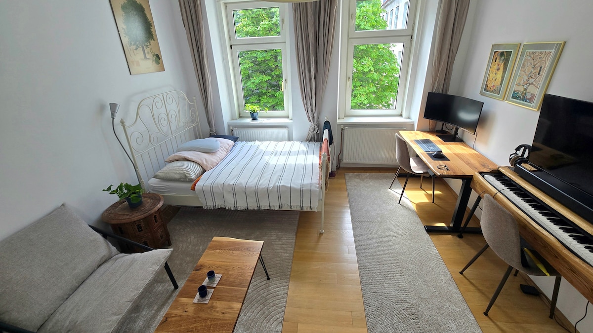 Entdecke Wien um die Jahrhundertwende: In unserem klassischen Wiener Gründerzeithaus, habe ich dieses Studio mit liebevoll ausgewählten historischen und modernen Einrichtungselementen gestaltet. Im Badezimmer mit Wanne und Regendusche entspannt es sich nach einem Stadtpaziergang besonders gut. Auch im Winter ist es dank Eichenparkett mit Fußbodenheizung so richtig gemütlich. Mit Frühstück und kleinen Mahlzeiten kannst du dich in der Küche mit Geschirrspüler jederzeit selbst versorgen.