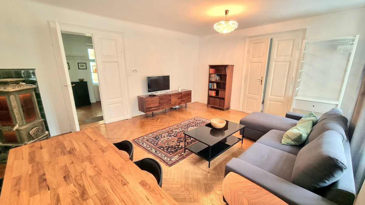 Charmante klimatisierte Altbauwohnung im 1. Stock, ideal für 2-4 Personen. Geräumiges Schlafzimmer mit Boxspringbett, Leseecke im Erker und Schreibtisch. Wohn-Esszimmer mit ausziehbarer Couch und TV. Gut ausgestattete Küchenzeile, großer Esstisch und englische Möbel. Modernes Bad mit Walk-in Dusche, Waschmaschine. Separates WC mit Duscharmatur.