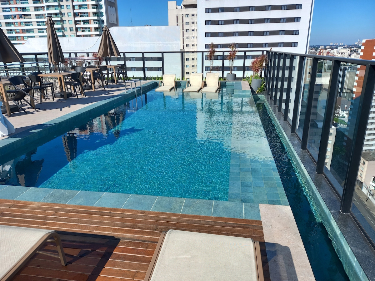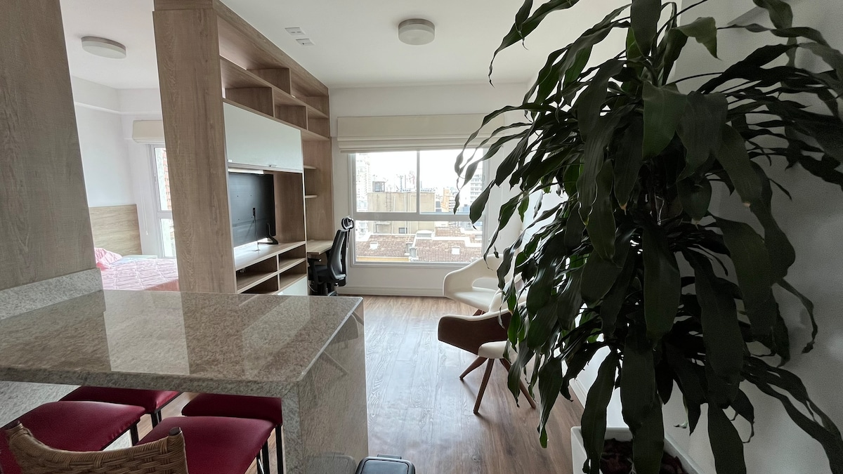 Welcome!! Moderno, prático e confortável. Este ambiente foi idealizado para proporcionar o bem-estar das pessoas que assim como eu, adoram viajar e ao mesmo tempo se sentir em casa. Super bem localizado, estamos próximos a shoppings, mercados, hospitais, confeitarias, bancos, farmácias e o prédio possui uma infraestrutura perfeita. Edifício com Porte-Cochère, portaria 24 horas e Cafetería