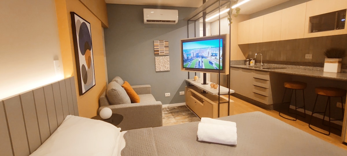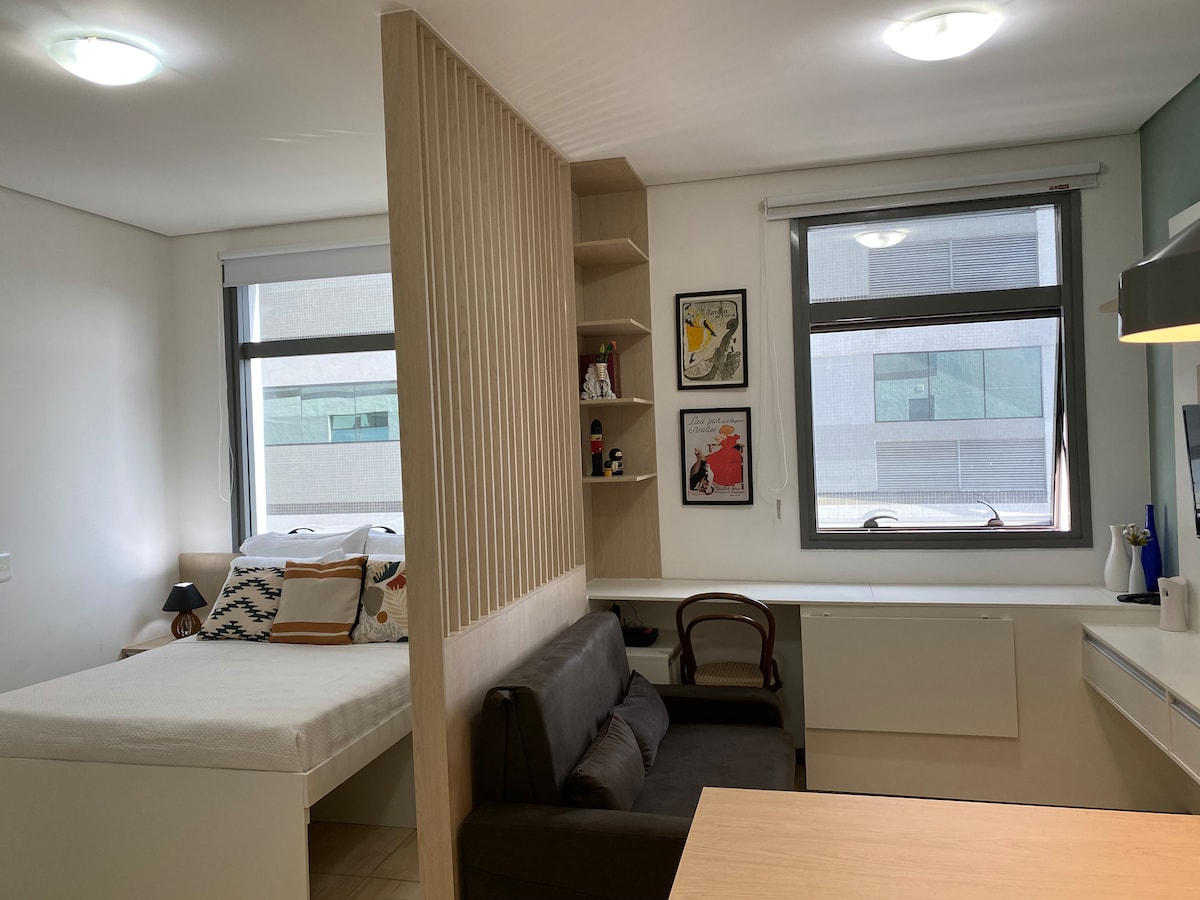 Estúdio novo e completo, para ate 3 pessoas em um dos prédios mais disputados de Curitiba. Em frente ao shopping Curitiba, e próximo a mais 3 shoppings. Totalmente seguro, portaria e segurança 24 hs. Vários restaurantes proximos, Hard Rock, outback . Muito bem equipado ,ar quente frio ,wi-Fi, TV, Cozinha bem equipada, maquina lava e seca no Estúdio. O prédio possui piscina aquecida ,sauna, academia ,brinquedoteca área de descanso na área externa com mesas, bancos, cafeteria dentro do condominio