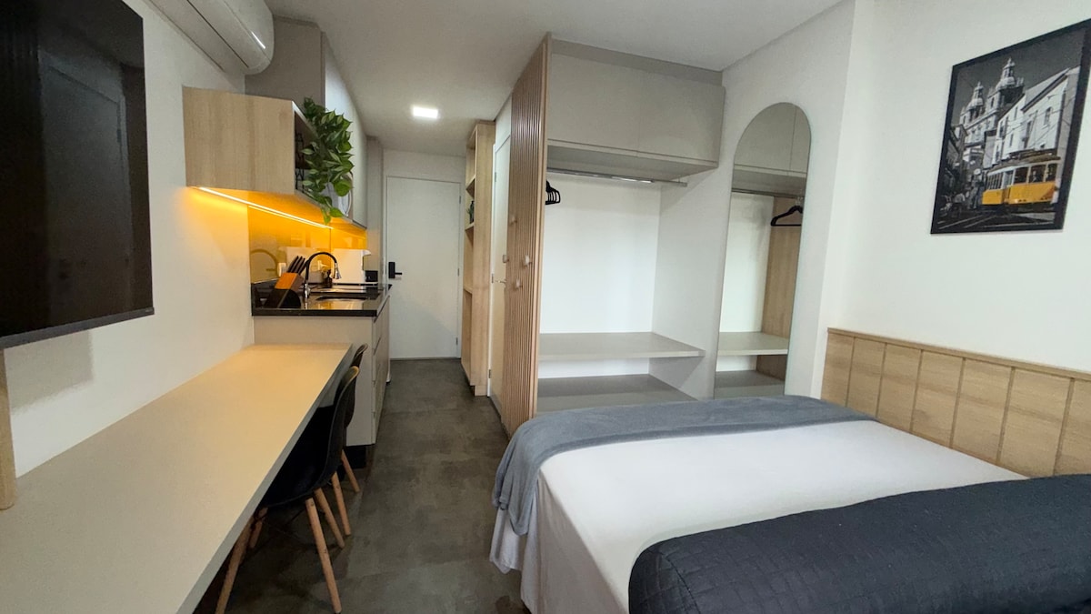 Desfrute de uma estadia confortável e prática na região central. O prédio é novo e oferece estrutura completa com piscina com vista panorâmica, academia, coworking, lavanderia compartilhada, áreas de lazer e convivência, portaria 24h e fácil acesso. Tudo isso em uma localização privilegiada, a poucos minutos dos shoppings Crystal e Curitiba, além de estar cercado por ótimos restaurantes, bares, cafés, farmácias, hospitais e mercados. E ainda tem o Hard Rock Café ali pertinho!