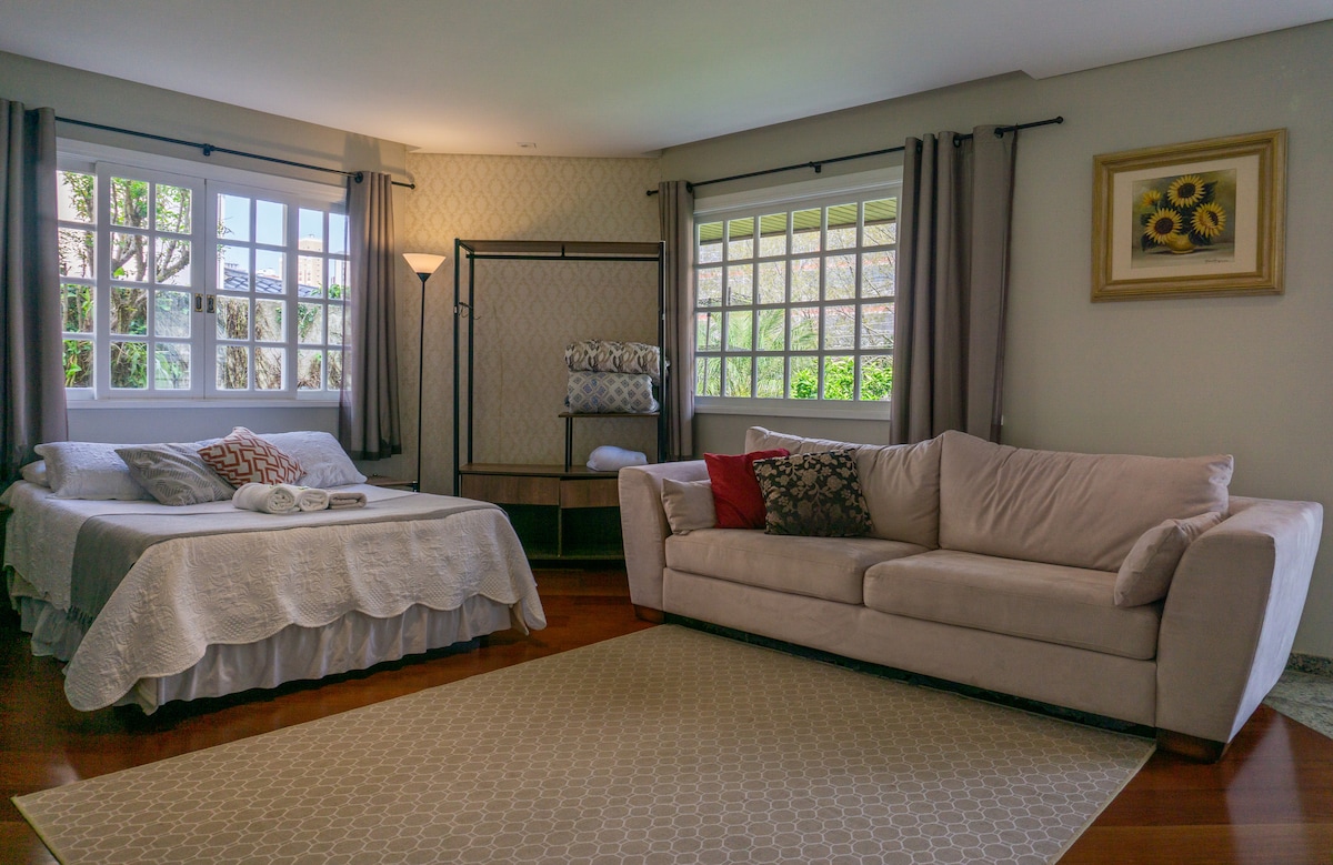Rest at a wonderful country house just 10 min from the tourist district of Santa Felicidade and 30 min from downtown Curitiba. Perfect for families to enjoy the countryside without giving up city comfort. Cozy home for 10 guests with 3 bedrooms, great amenities, and views of 2 lakes. Garden BBQ, game area with pool table, foosball, jacuzzi**, kids’ houses and trampoline. Come enjoy this unique place! **Fees apply to these items; verify rules.