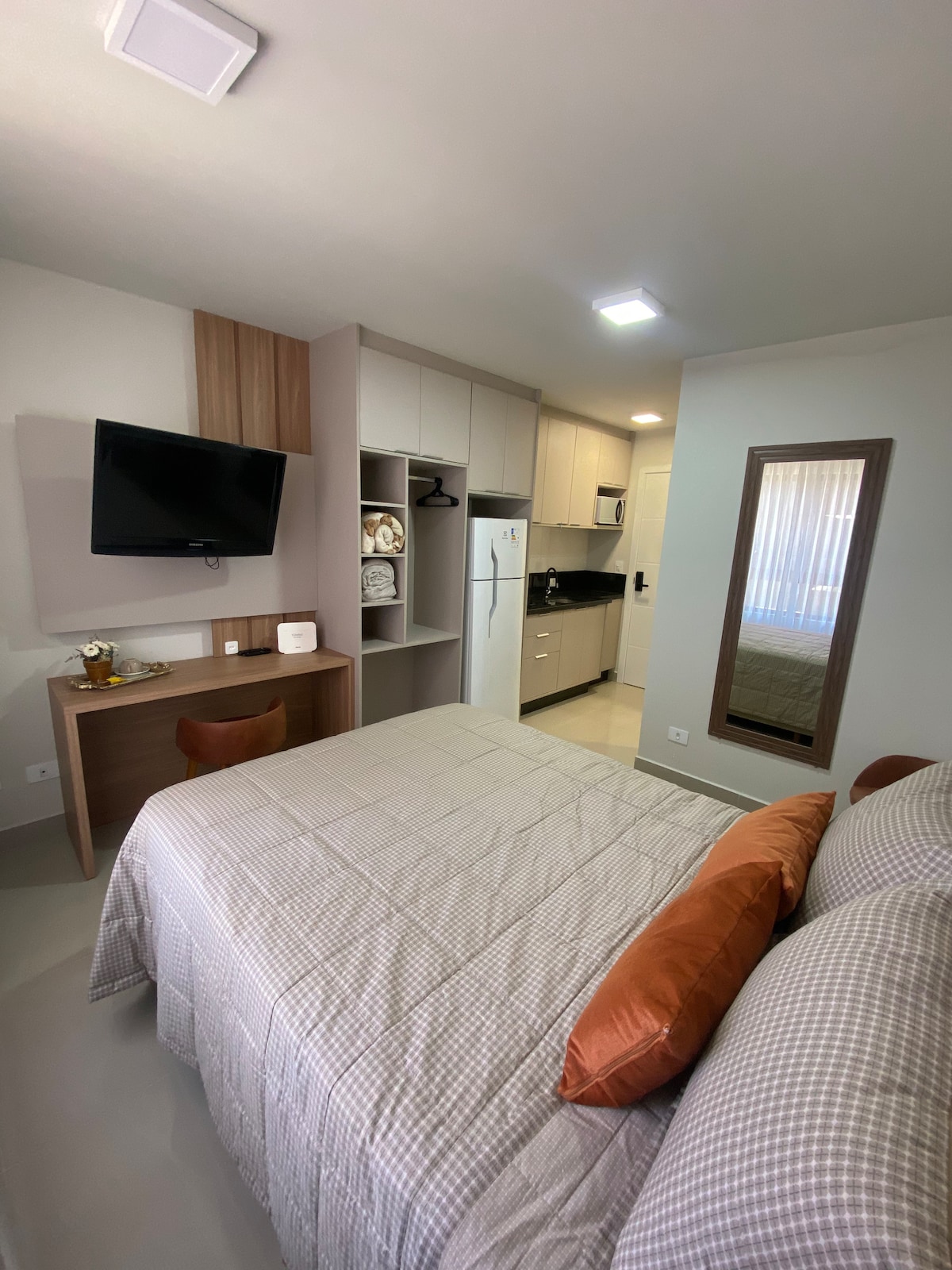 Studio aconchegante no coração de Curitiba! Perfeito para até 2 pessoas, nosso studio conta com cama confortável, cozinha equipada, TV, Wi-Fi, armários e ar-condicionado. O prédio oferece estrutura completa: recepção 24h, espaço de coworking, lavanderia, cobertura com vista incrível e áreas de lazer. Estacionamento pago a parte ao lado e localização excelente, no centro, com supermercado, restaurantes, universidades, shoppings, hospitais, pontos turisticos, e tudo que você precisa bem pertinho!