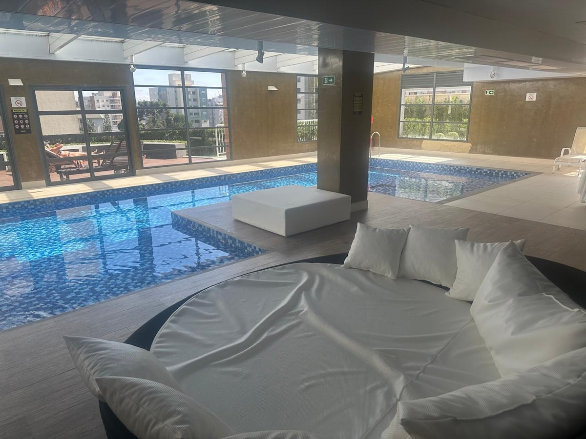 O estúdio está em um condomínio clube de alto padrão, com garagem inclusa. Nas áreas comuns possui: piscina coberta e aquecida (uma delícia!), academia, lavanderia, quadra, parquinho, horta, mercado autônomo, espaço para trabalho e sauna. É uma gracinha, bem completo, acomoda 4 pessoas (1 cama casal e 1 sofá cama), tem ar condicionado, uma ducha gostosa pro banho e uma cozinha completa. É pra se sentir em casa mesmo!