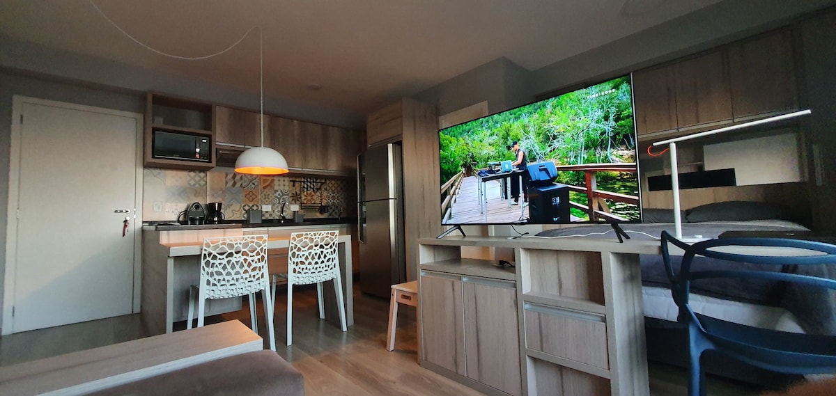 Studio moderno, novíssimo, aconchegante, perfeita localização, com uma linda vista da sacada, principalmente a noite . Wi-Fi rápido, mesa de trabalho, TV smart 55” , cama Queen. Ar condicionado (quente/frio). Máquina de lavar e secar roupa e uma linda ilha na cozinha. 50m2 de muito estilo-27ºandar, Silencioso. No Centro/Batel, próximo à comércios, bancos, shoppings, polo gastronômico e Hospital . No prédio :Piscina, academia, sala de jogos, sauna, jacuzzi, portaria 24 horas.
