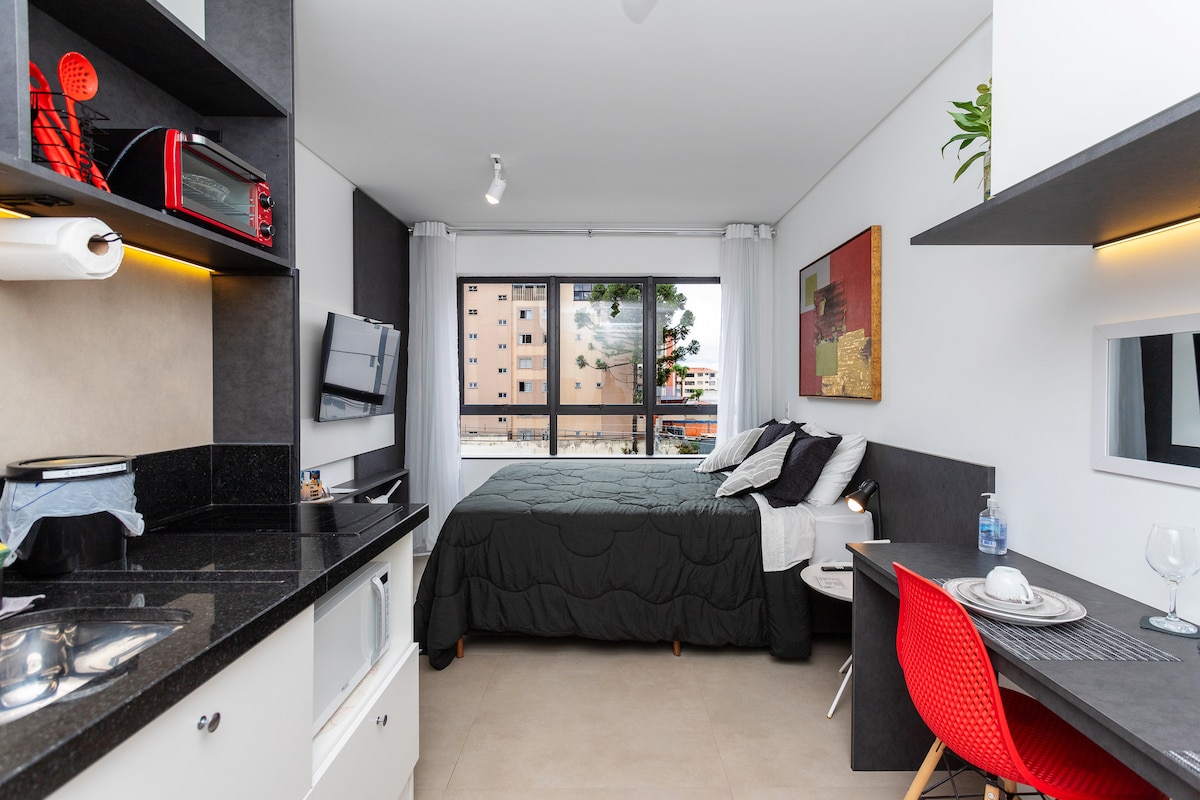 Modern studio condo in Rebouças, 5 min from Mercado Municipal, Shopping Estação, and near cafés and bars. Easy access: 10 min to the bus station, 25 min to the airport. AC + heating; gas water shower; co-working; 400 Mb Wi‑Fi + desk; queen bed with hotel‑style linens + blackout shades; equipped kitchen; smart TV streaming; 24 h self check‑in; laundry & gym in the building.