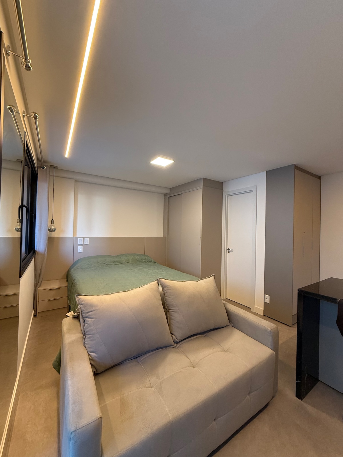 Batel só pra vocês dois. Studio do Lifespace Curitiba, em frente ao Shopping Curitiba (do outro lado da avenida), com ambientação dividida por estante metálica vazada entre quarto e sala, cama padrão hotelaria e cozinha integrada. Acomoda 2 hóspedes com conforto real, pensado pra casal. Piscina aquecida coberta, academia, sauna, sala de jogos e mercadinho no próprio prédio. Garagem inclusa na diária. Fechadura digital para check in sem atrito. Perfeito para casais em viagem a dois.