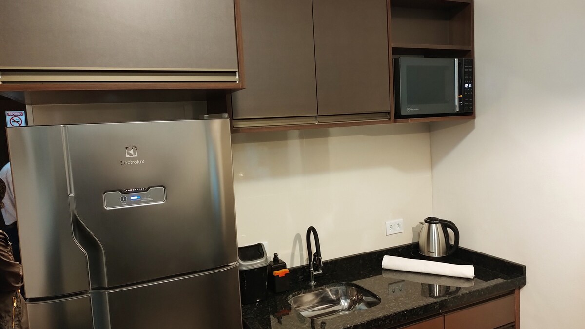 Stúdio de 30 mts² com internet de 400 mega, região privilegiada, central, frente ao Shopping Curitiba, praça ao lado, áreas de lazer espaçosa e ajardinada. Decorado, com roupas de cama, banho, tapete. Ideal também para home office Na cozinha: panelas, cafeteira elétrica, sanduicheira, liquidificador, garrafa térmica, chaleira elétrica, talheres, louças, jarra e copos, pano de louça. Smart TV43 pol, ar condicionado, geladeira c/freezer, persianas, cama box, sofá, micro ondas, exaustor e Wifi.