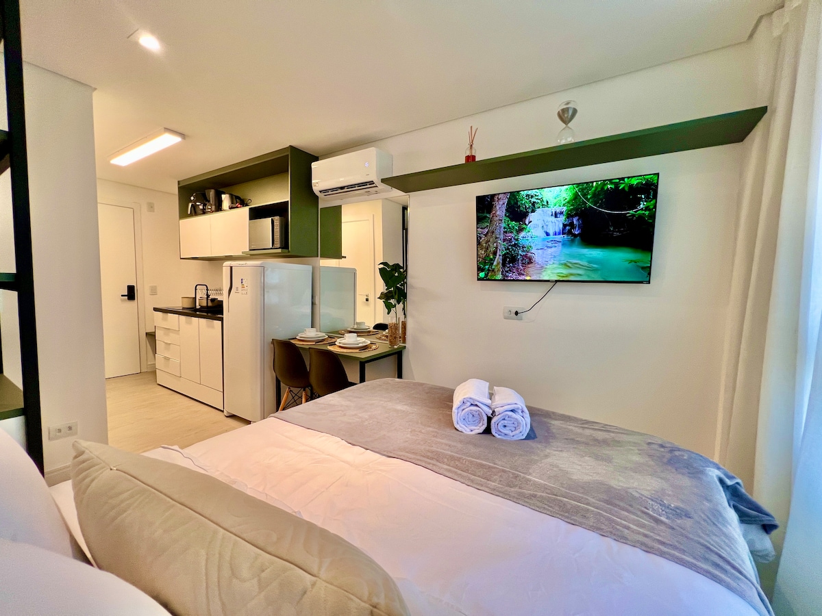 Studio amplo, funcional e silencioso em localização privilegiada. Cama king-size, sofá-cama com colchão de verdade, TV com Chromecast, internet rápida e espaço dedicado para trabalho, varanda com cadeiras confortáveis e vista para o Bosque do Papa, cozinha funcional com cooktop, microondas, frigobar e o essencial para fazer café e preparar refeições simples. Em poucas quadras você encontra MON (Museu do Olho),, Bosque do Papa, Supermercado, Farmácia, Conveniência 24h e ponto do Ônibus Turistico