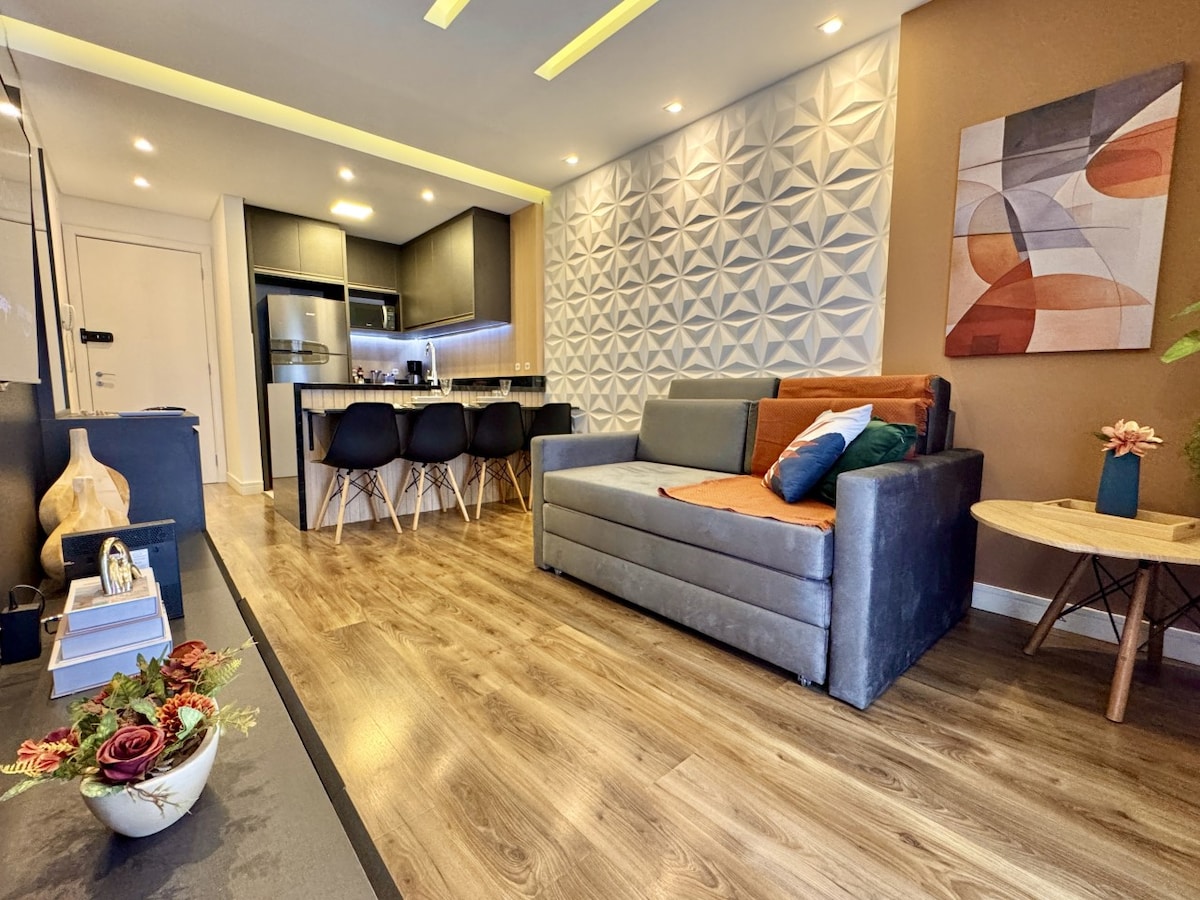 Apartamento 1 quarto com acabamento premium no Batel. Quarto com cama de casal, parede 3D e iluminação LED como destaque visual. Sala com sofá cama, cozinha equipada e sacada. Ar condicionado. Para até 4 hóspedes, ideal para casais ou viajantes a trabalho. O Sky é condomínio clube com duas piscinas (coberta aquecida e ao ar livre), sauna, jacuzzi, academia, sala de jogos, playground, brinquedoteca e mercadinho. Garagem inclusa na diária.