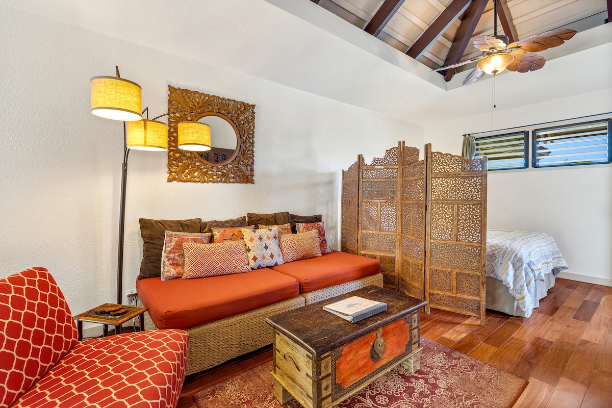 Bask in the sunshine & aloha while relaxing in our bright, spacious & serene studio. The property boasts lush, tropical surroundings filled with swaying coconut trees, birds of paradise, orchids & koi ponds. This comfortable, airy top-floor unit is a stone's throw from the ocean where cool trade winds blow year round. The condo is walking distance to Kauai's best surf breaks, beaches, snorkeling, restaurants & shopping. Enjoy endless rainbows & surreal sunsets across the Kauai sky.