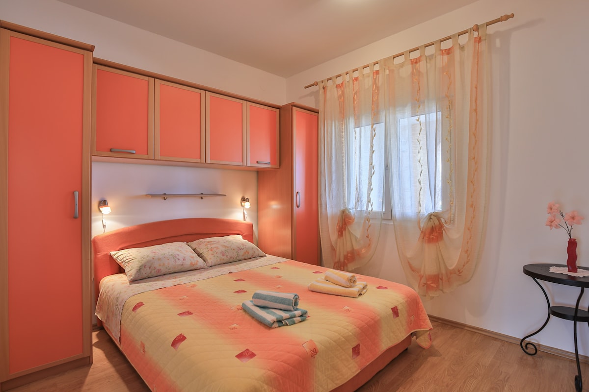 Apartment is placed in private house, 250 m distanced from the sea and about 600 m from center of town. It is placed in ground floor with garden and feel, ideal for families with kids. There is also a pool big enough for having fun with family and friends or just relaxing. We welcome you with the small gift of gratitude consisted of chilled welcome drinks and some products from our locals, so you can experience more of our region and contribute in its sustainability.
