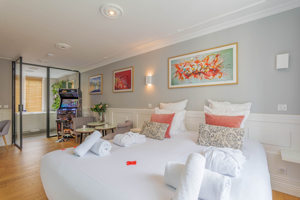 It's all there! Comfort and practicality in 10m² of unique, warm mezzanine design. Whether you're a solo traveler or a couple, you can unwind after a hard day's work or a city tour, in a bed as soft as whipped cream. 49-inch TV and Chromecast available in the room, with full wifi. Rrainfall shower and eco-friendly products, library of curiosities.