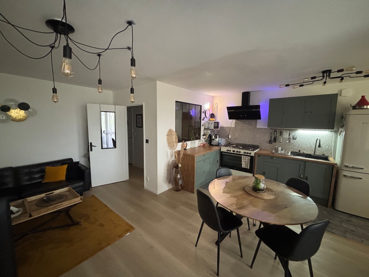 Elegant renovation by interior designer for my SymbioHome 2nd edition (Lille Gares/Madeleine) located in a charming and QUIET area 100 meters from the best shops and 7 mn from the tramway. 5 refined bedrooms, adjustable from 5 to 9 beds, 2 bathrooms, 2 toilets and a magnificent fully equipped kitchen open on the large living room. Romantic : the equipped and shaded patio under the wisteria. An experienced host offering SymbioHome 1st edition (Lille Centre) since 2016.