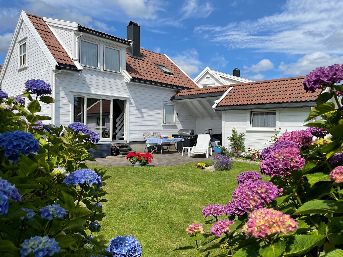 Stort helt nytt sørlandshus med stor hage sjøbu, egen strand og brygge. Passer fint for 2 familier. I oktober november tar vi med leietakere på hummerfiske. Båt. Øien 20 fot med 70 Yamaha Masse aktiviteter - fotballbane, volleyballnett, badminton, husker for store og små, slakk line, trampoline, kubbespill. 5 kajakker, 2 supbrett, 2 vannmadrasser og fiskeutstyr for fiske med brygga eller på sjøen. Fisketur med teiner, garn eller stang etter avtale. Badstue tilgjengelig for leietakere