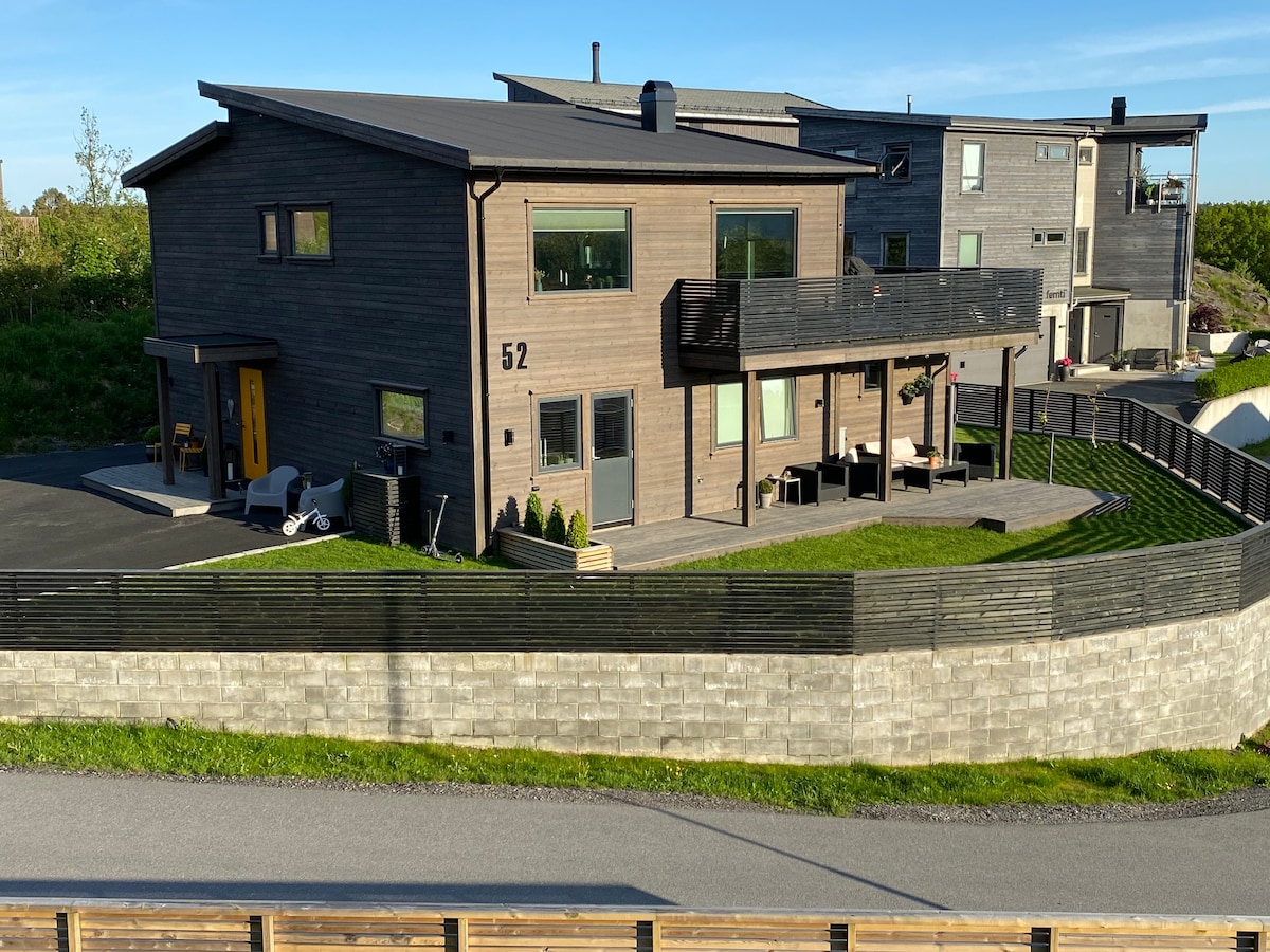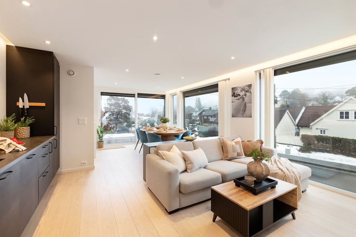 Her kan du og familien din bo i et fredelig, nybygd område. 4 minutters gange til busstopp som tar deg direkte til Arendal eller Kristiansand. 12 minutter kjøring til Dyreparken, en fin spasertur unna Lillesand sentrum med koselig smug, unike butikker og deilige matfristelser. Sjøen ligger nært, samme med lekeplasser. Leiligheten ligger høyt og du kan nyte fantastisk lys fra tidlig til sent fra verandaen