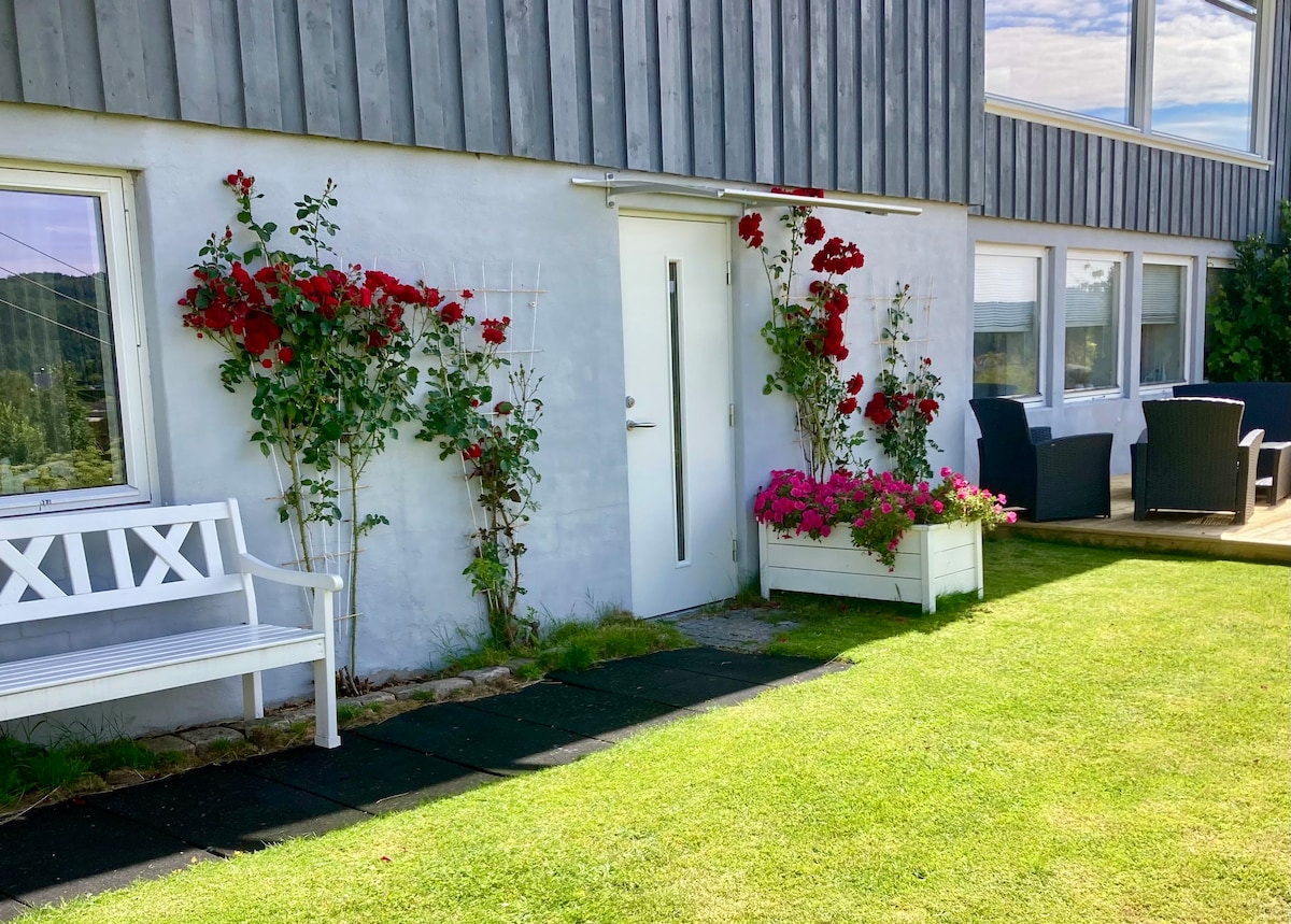 Besøke Kristiansand Dyrepark, jobbe, golfe, fiske eller feriere på Sørlandet? Stor, landlig, velutstyrt leilighet, 2 soverom, 6 sengeplasser. Gratis parkering for flere biler, elbillader. 20 minutter til Dyreparken, 15 minutter til Kjevik flyplass, 17 minutter til Hamresanden, Norges lengste sandstrand og 30 minutter til Kristiansand som har ferje og togforbindelser. Stille og rolig med god uteplass og utsikt til Tovdalselva. Bade og fiskeplasser i gangavstand