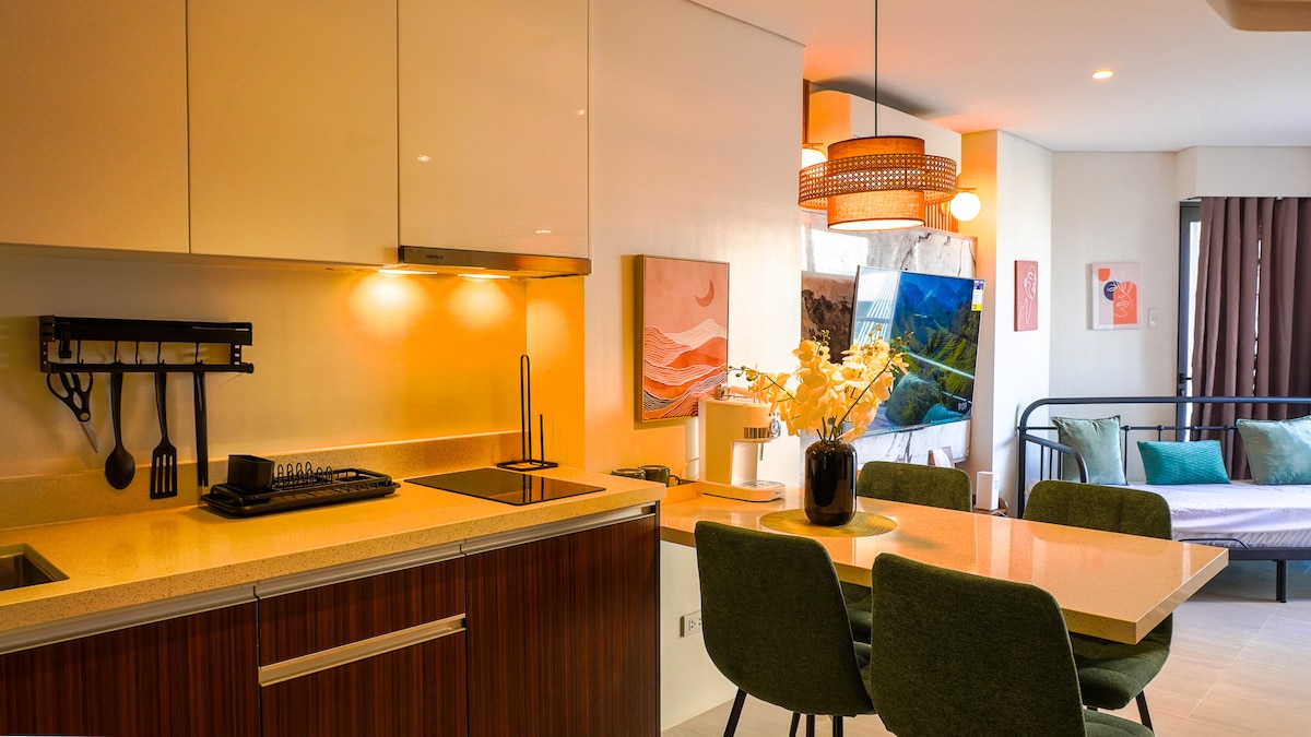 Enjoy a stylish experience at this centrally located place. Relax in this entirely cozy, modern and vibrant condo unit that is conveniently located near Mactan International Airport. Where it is close to everything like restaurants, coffee shops, laundry shops, malls and supermarket. - 3-5 minutes away from Mactan Airport - High-Speed Internet up to 200 Mbps - 65 inches TV with free Netflix - 1 Bedroom w/ 1 queen-size bed & 1 Foldable double size bed - Washing Machine -Fully equipped kitchen