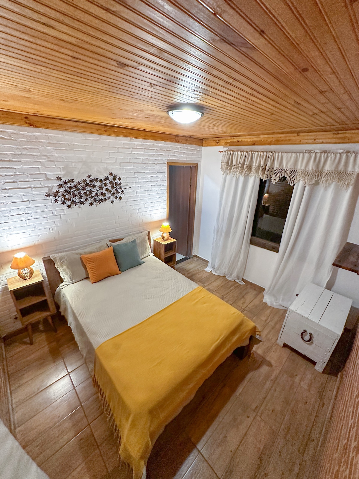 A Suíte Máster é uma acomodação independente no 2º andar da Casa do Edi. Localizada na parte alta da vila, onde é possível apreciar as belas paisagens das montanhas e um incrível visual para o pôr-do-sol. A suíte máster, conta com hidromassagem e linda vista panorâmica para a natureza exuberante que nos rodeia por aqui. Além disso, a fim de proporcionar mais conforto e comodidade, possui lareira para dias frios, sacada com churrasqueira, cozinha compacta e piscina em área de lazer compartilhada.
