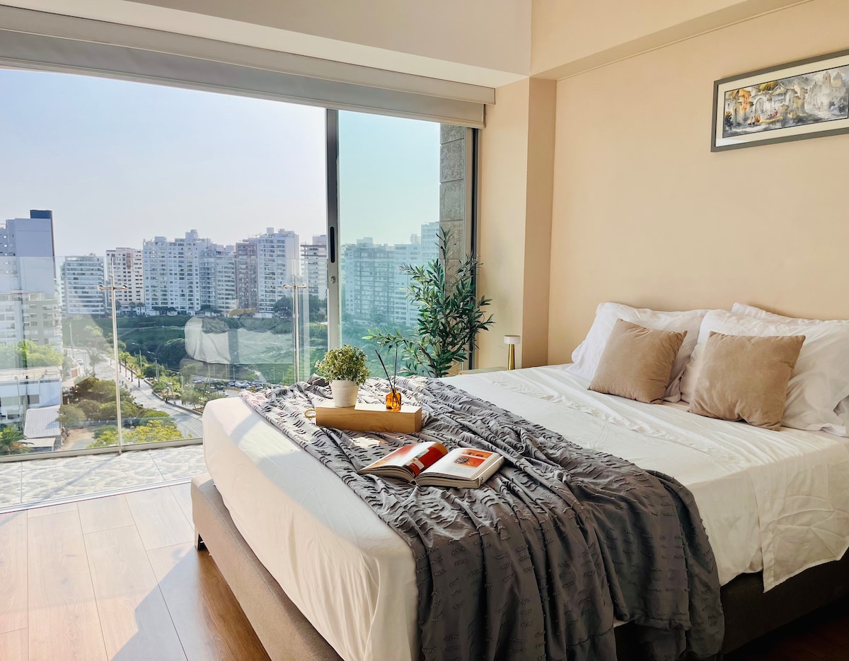 Luxurious Airbnb with breathtaking ocean views, blending modern elegance and ultimate comfort. A block way from the NEW “Puente de la Paz”. Relax in a chic, cozy space with state-of-the-art air conditioning, lightning-fast fiber optic Wi-Fi for remote work, and premium appliances. TOTO toilet. Walking distance from Maido the #1 restaurant in the world (2025) and Central (2023), plus top-tier eateries, artisanal coffee shops, museums, and Larcomar mall.