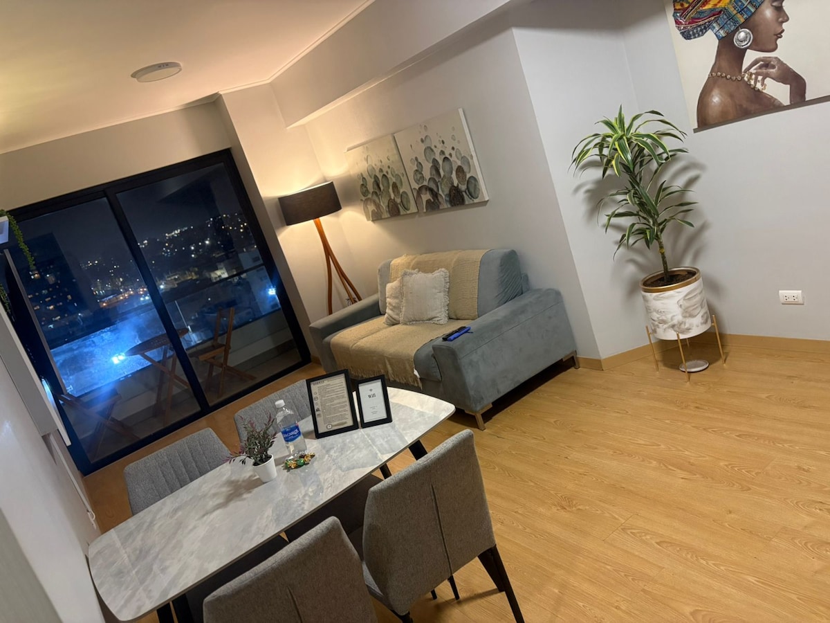 El Departamento esta ubicado cerca al aeropuerto y a 15 minutos de Miraflores por el circuito de playas ,puedes disfrutar de una vista al mar desde todos los ambientes ,contamos con servicio de transporte y tenemos soporte al huespede 24/7. . El departamento está totalmente equipado , agua caliente de alta velocidad, Wifi , 2 TVs de 55’ y cuenta con una piscina panorámica en el ultimo piso , así como sauna y gimnasio .