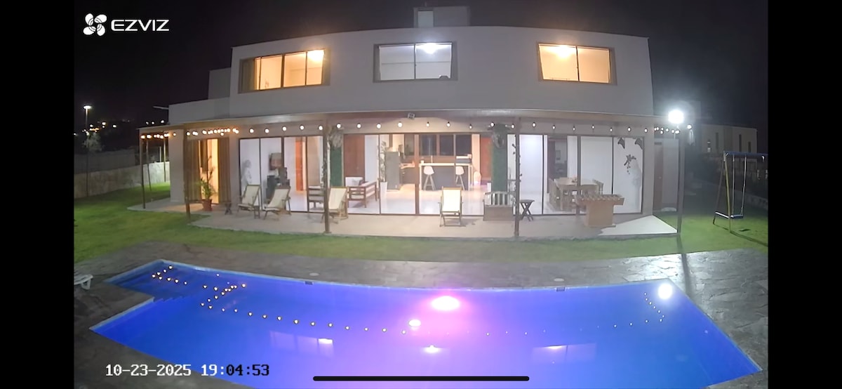 Hermosa Casa con Piscina (1200m2), ideal para pasar tiempo en familia, zona tranquila para desconectarse del bullicio de la ciudad. La piscina tiene una patera para niños (ver fotos). Terraza con reposeras para el descanso. Zona para hacer la parrilla/horno artesanal, mesa para comer al aire libre, amplio jardín para el esparcimiento, Juegos como Sapito, Futbolin, Voley, cocina y menaje equipado. 5 Dormitorios amoblados c/u con baño propio. La casa es de uso exclusivo de los huéspedes.