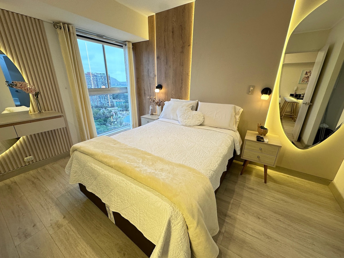 Relax and enjoy your stay at this beautiful apartment located in San Miguel. The apartment is brand-new with new kitchen appliances, washer and dryer, and two TV's (one in the living room and Master bedroom). The living room has a balcony to enjoy your mornings with the ocean breeze. The master bedroom also has an amazing view of the ocean. There is a 24/7 security at the front desk and has a rooftop pool. It is located on the 17th floor