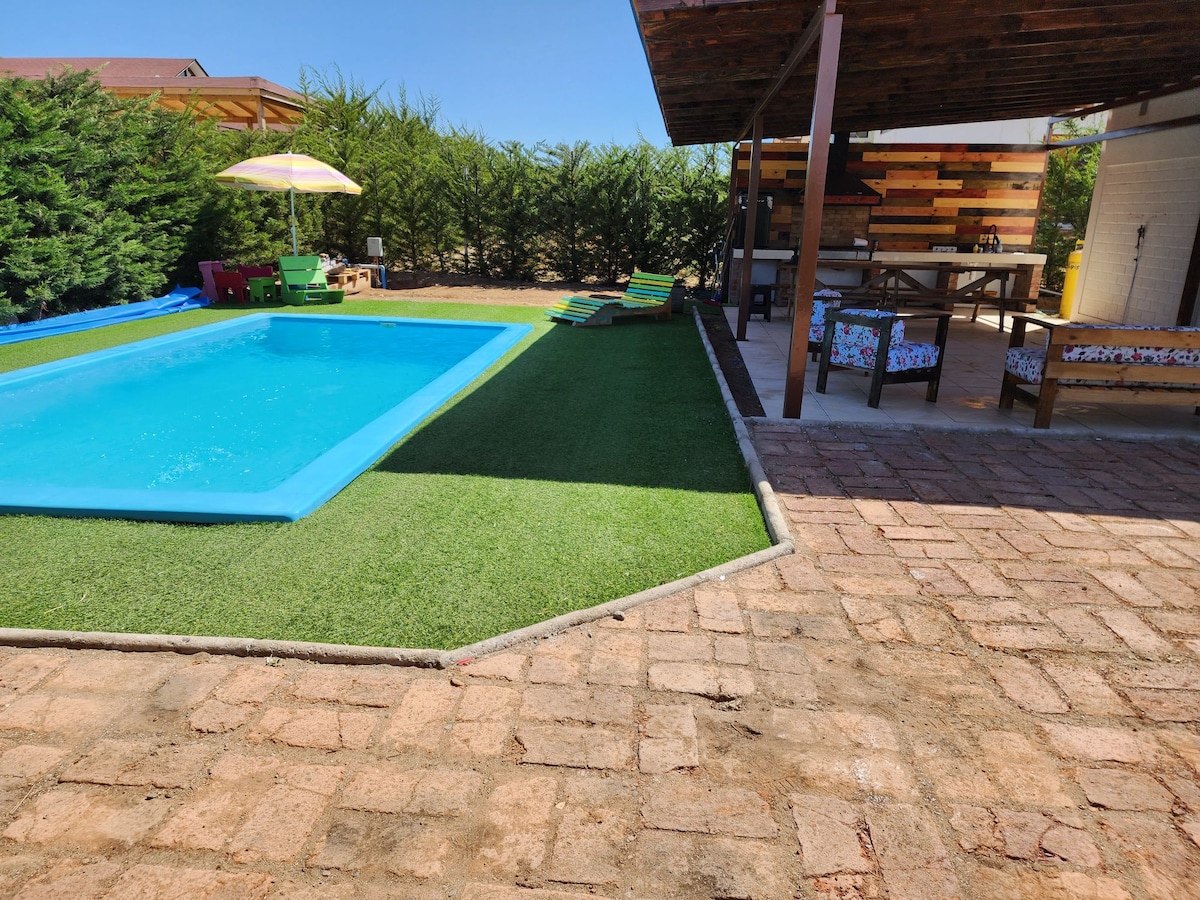 En este alojamiento se respira tranquilidad: ¡relájate con toda la familia!. Cabaña ubicada en parcela de 5000m2 con vista al mar a sólo 3 a 5min de playa en auto, sólo existen 3 cabañas con piscina, zona de fogata, quincho, juegos infantiles. El lugar permite el contacto con la naturaleza, estando en zona playera y campestre al mismo tiempo. La cabaña mostrada tiene cocina full equipada, 2 dormitorios, cocina full equipada, 1 baño, mesa de terraza, terraza, parrilla,wifi y tv.